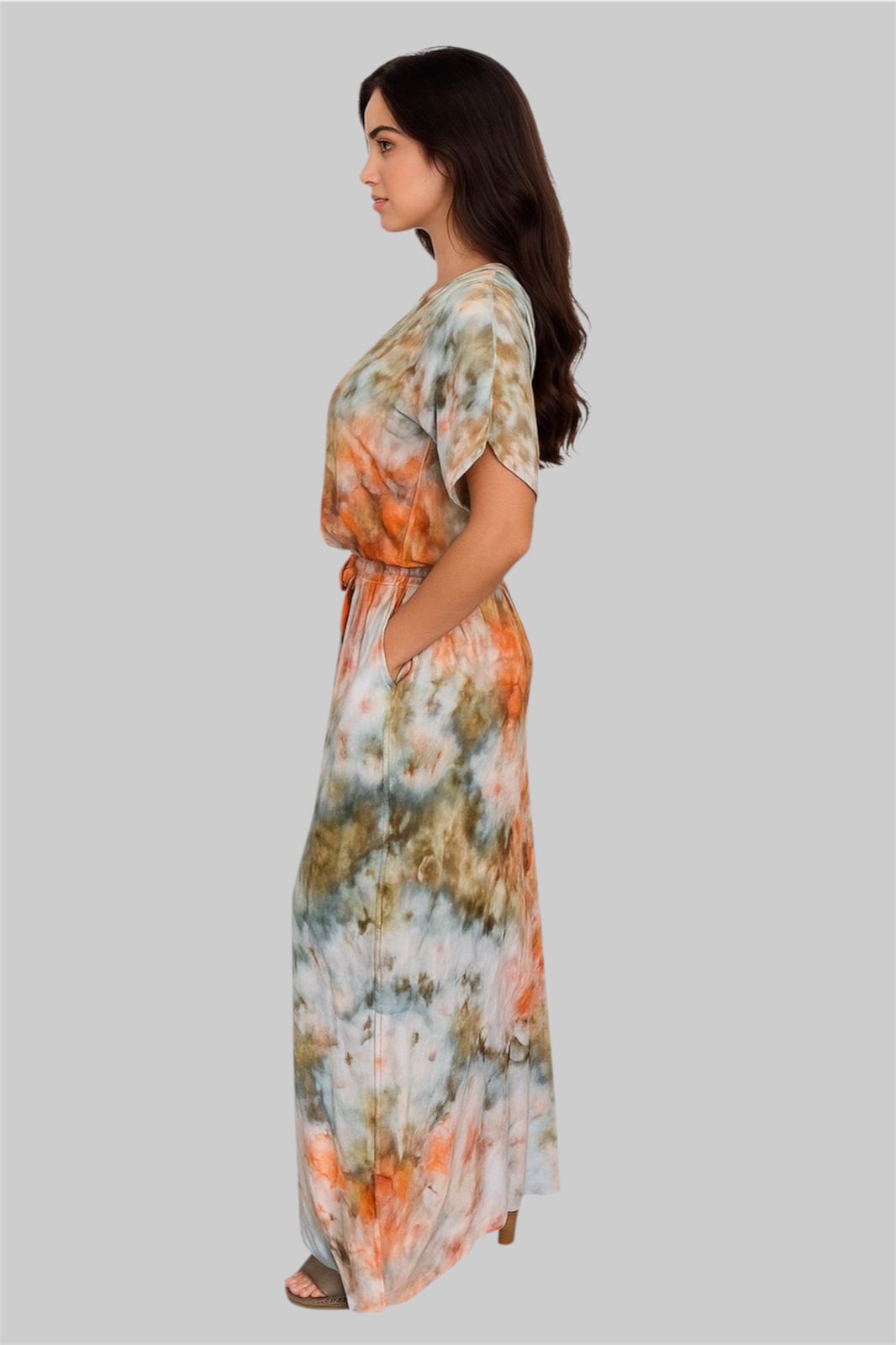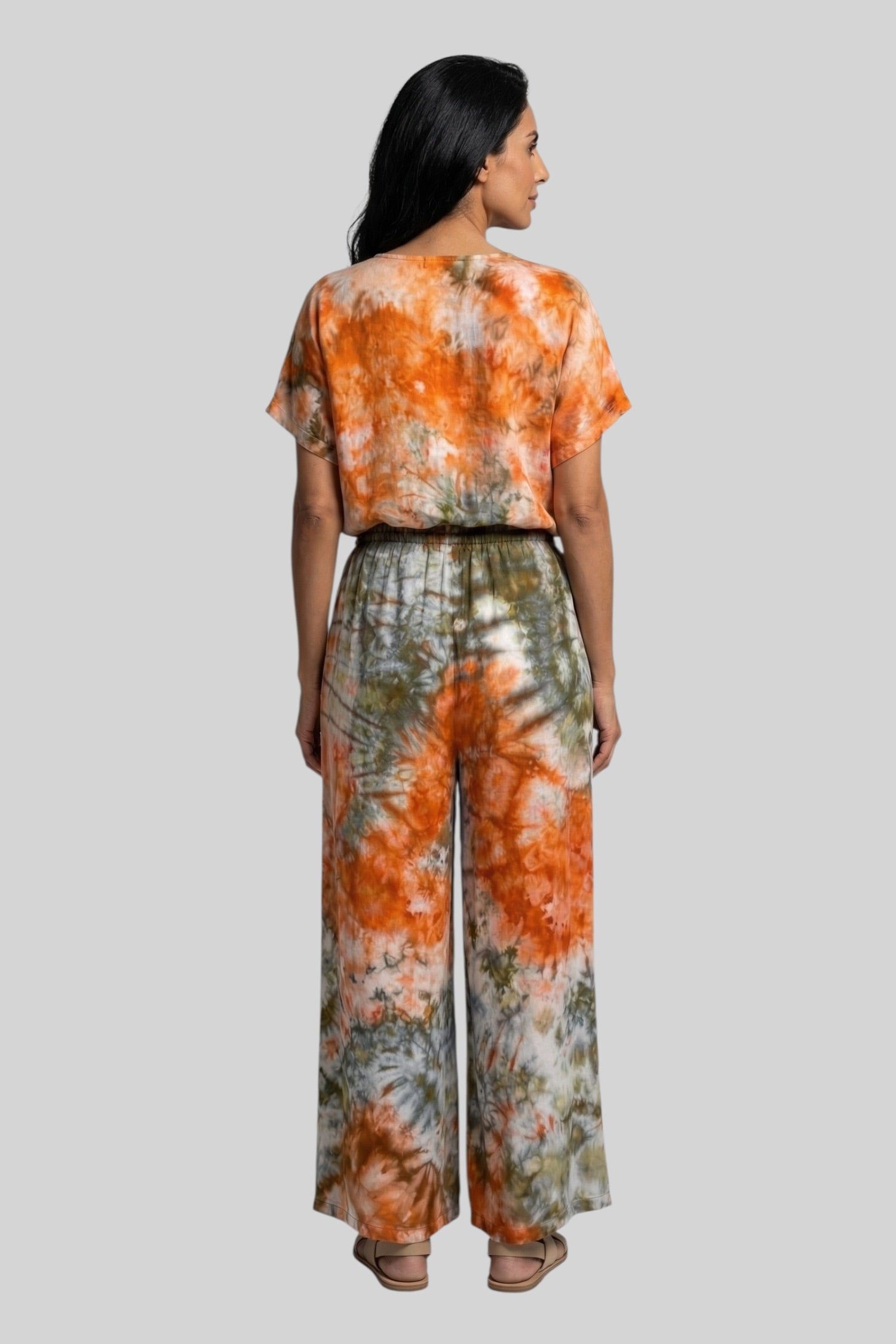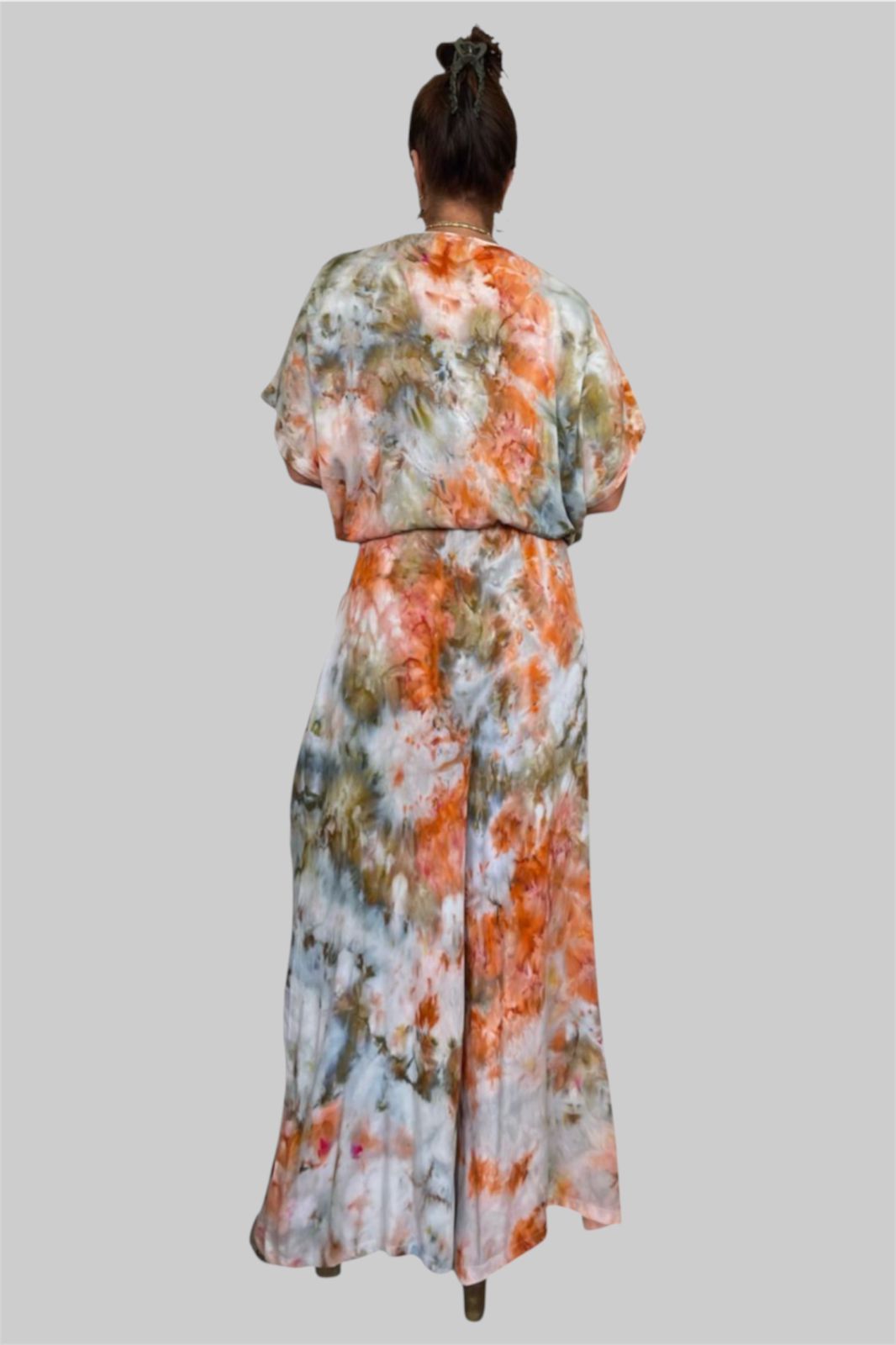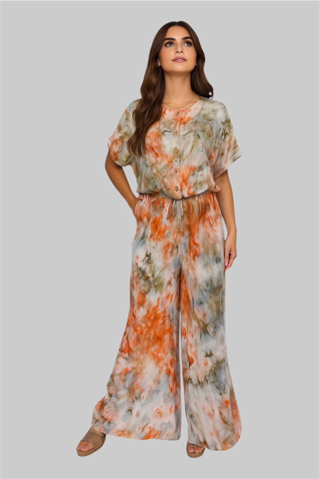 حوّلي كل خطوة إلى تحفة فنية مع هذه الجمبسوت الفريدة المصبوغة يدويًا بتقنية الجليد. مصنوعة من فيسكوز ناعم يسمح بمرور الهواء، تتميز بتصميم واسع مريح وأزرار أمامية لإطلالة أنيقة بكل سهولة. درجات اللون البرتقالي الترابي والزيتوني والرمادي الناعم تُضفي لمسة فنية أنيقة - لا يوجد قطعتان متطابقتان تمامًا.