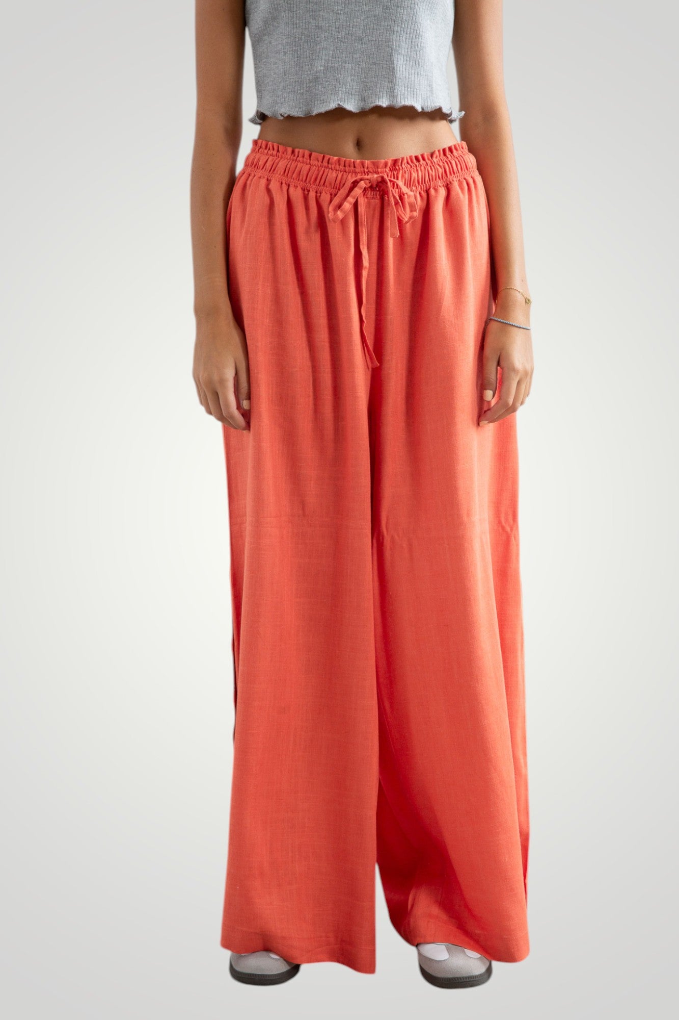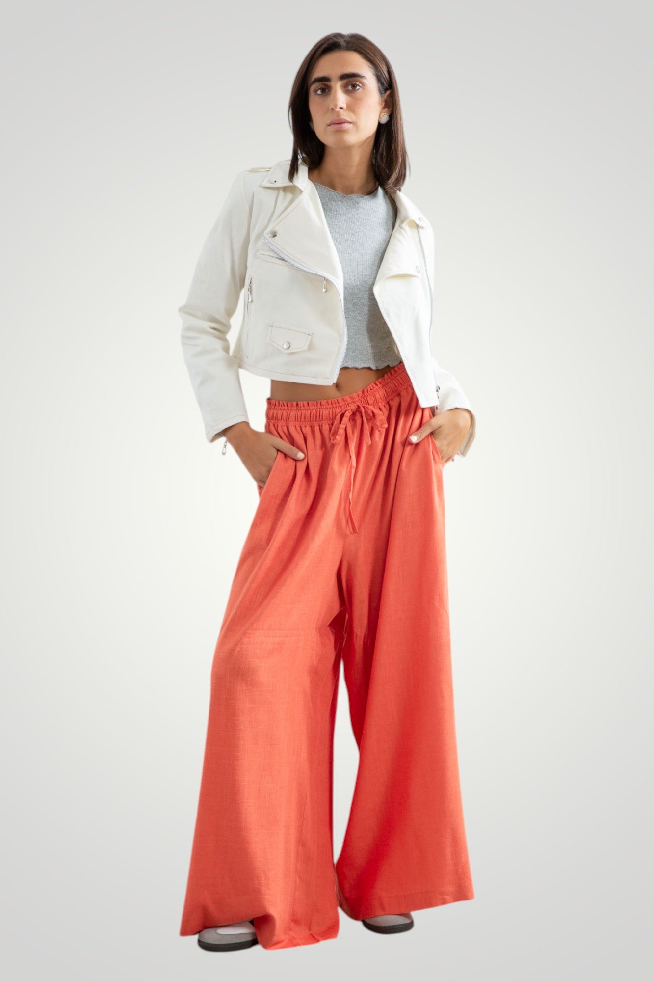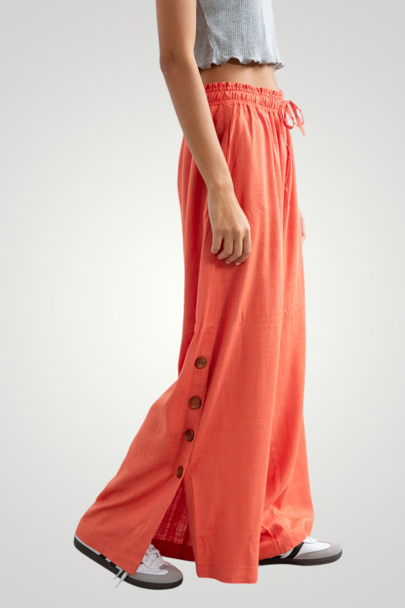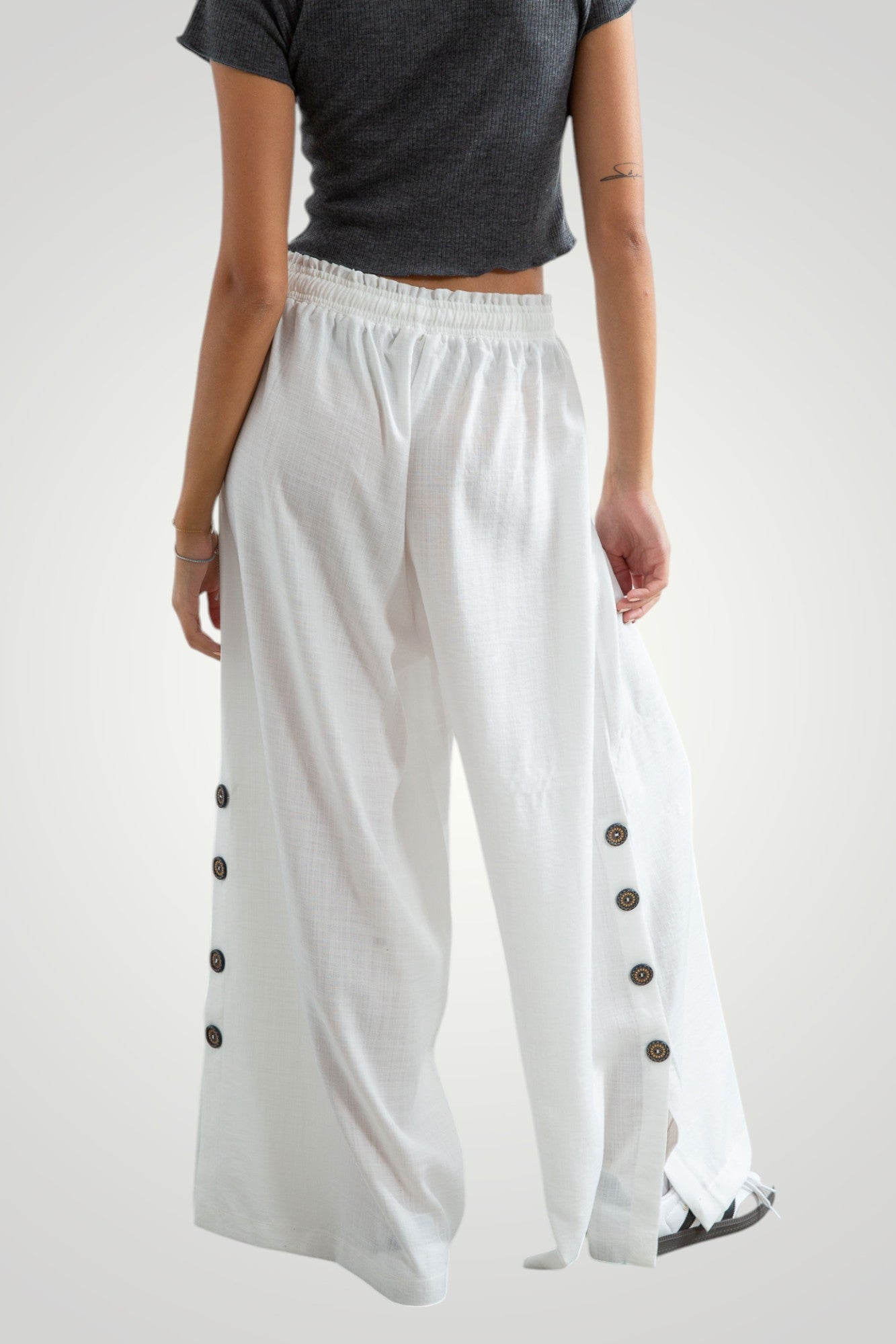 بنطلون واسع الساق مع خصر مطاطي قابل للتعديل وأزرار خشبية جانبية وجيوب