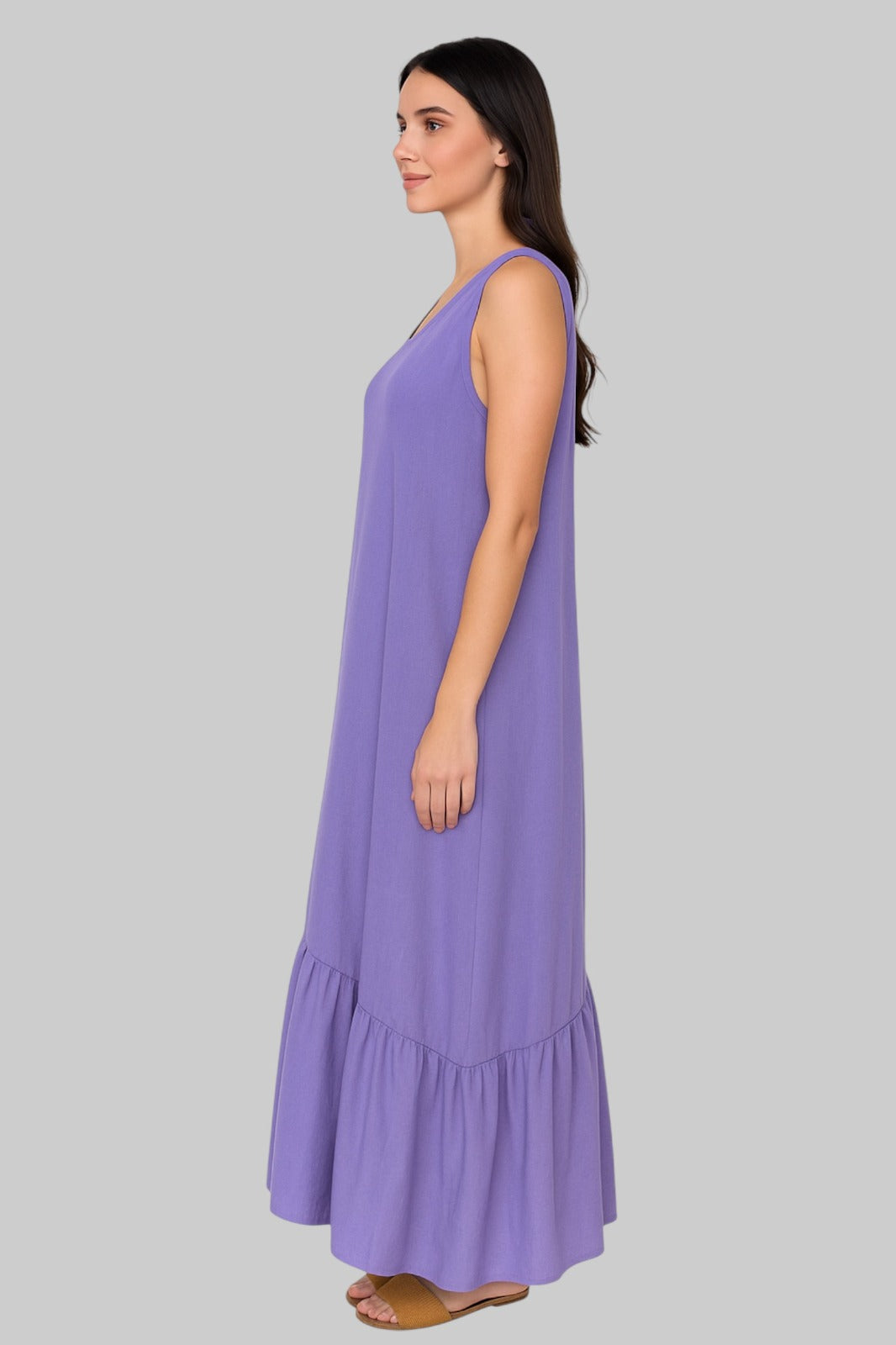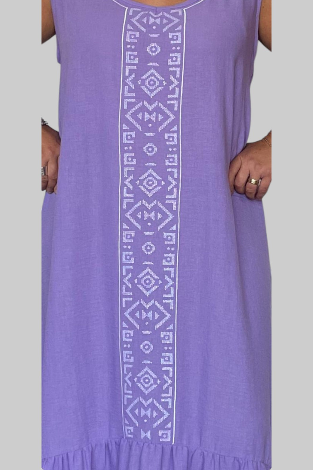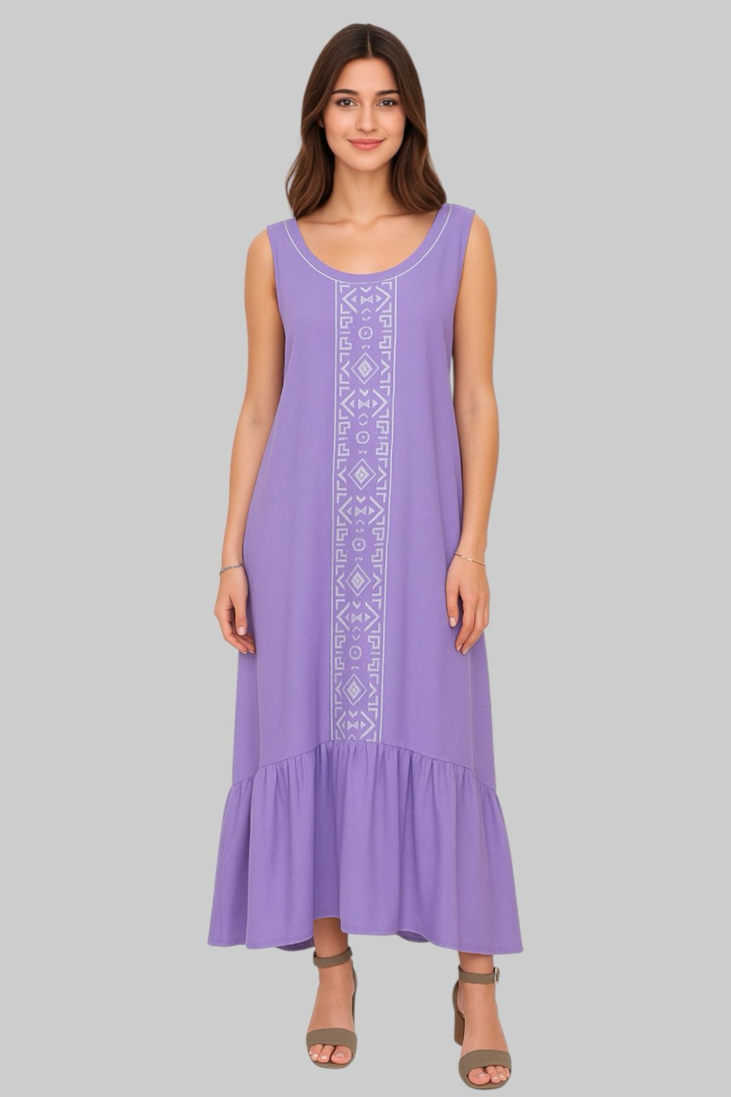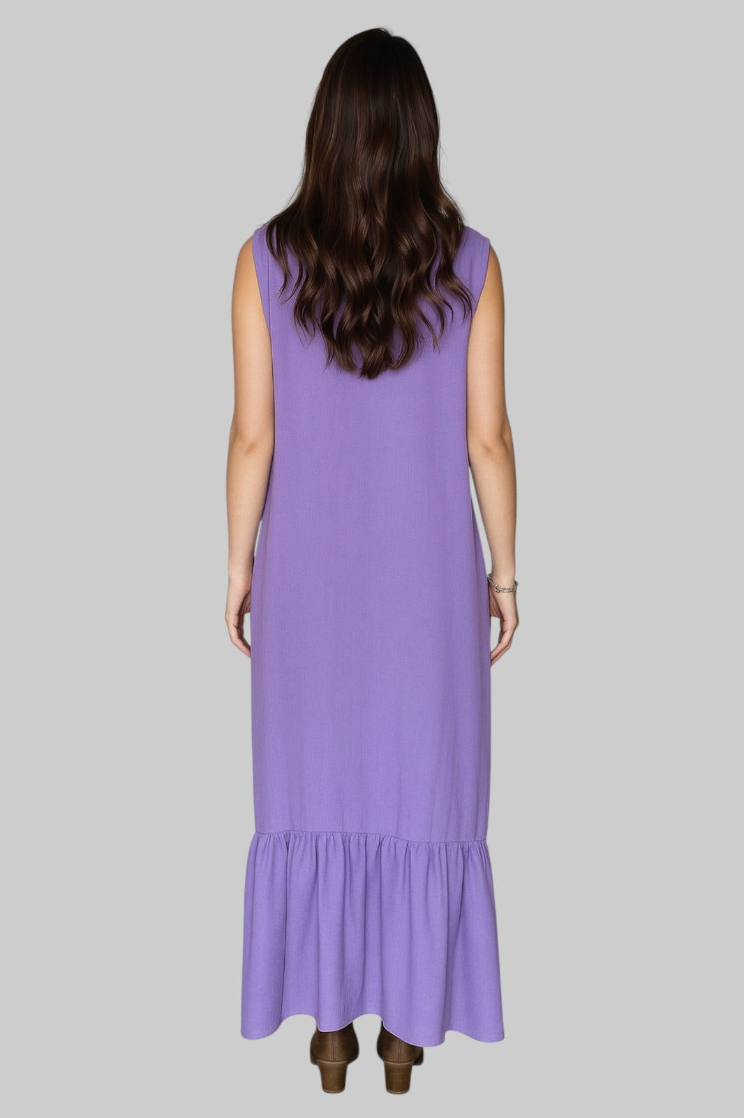 أناقةٌ بسيطةٌ تلتقي براحةٍ يومية. هذا الفستان الماكسي بدون أكمام، مصنوعٌ بلونٍ أرجوانيّ ناعم، مزينٌ بتطريزٍ رقيقٍ مستوحى من القبائل على طول الجزء الأمامي، ليضفي لمسةً من السحر الحرفي. ينسدل تصميمه المريح والانسيابيّ بشكلٍ رائعٍ مع حاشيةٍ مكشكشةٍ تُضفي حركةً وأناقةً على كل خطوة.