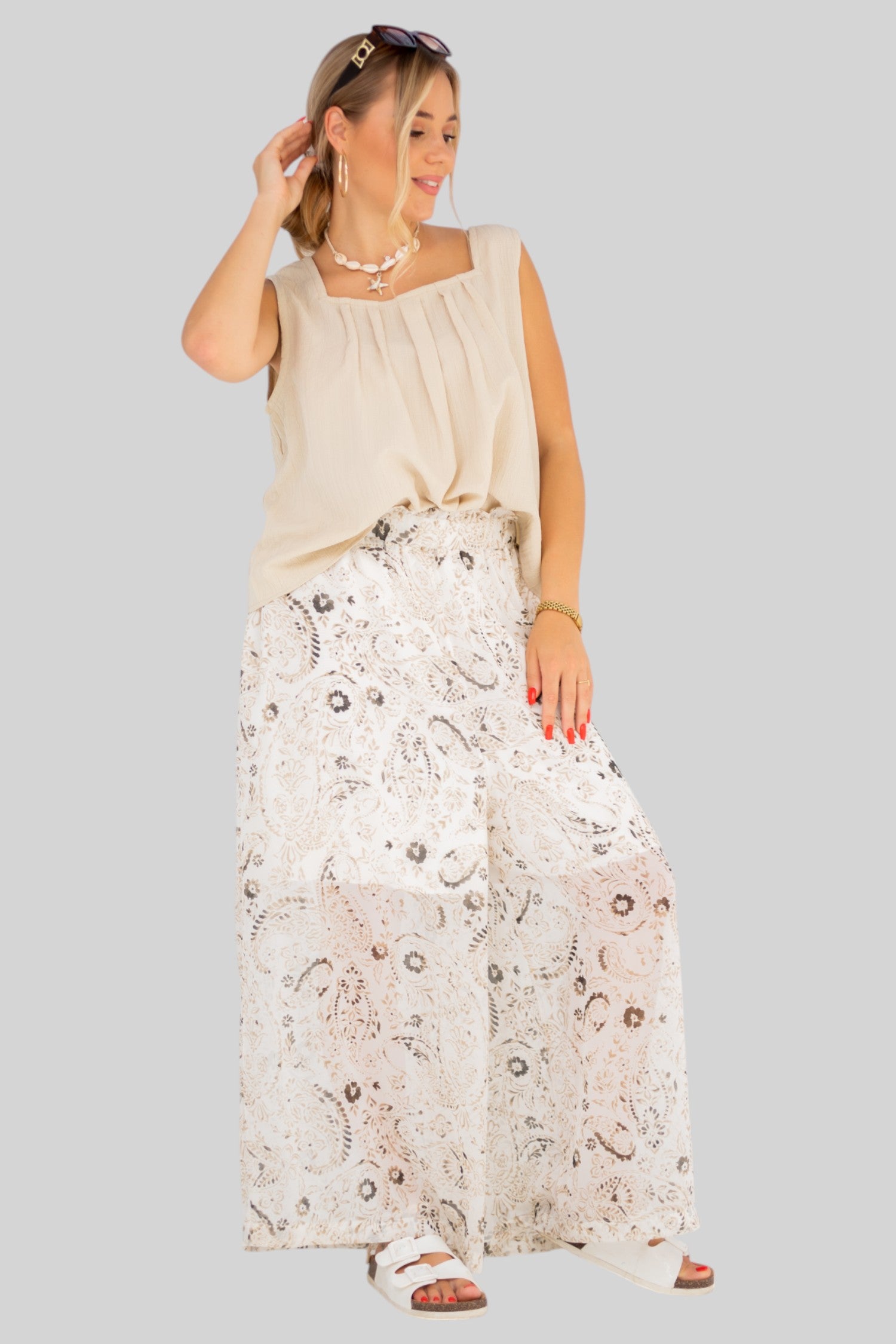 Printed Chiffon wide legged pants with viscose knee length lining, elastic waist