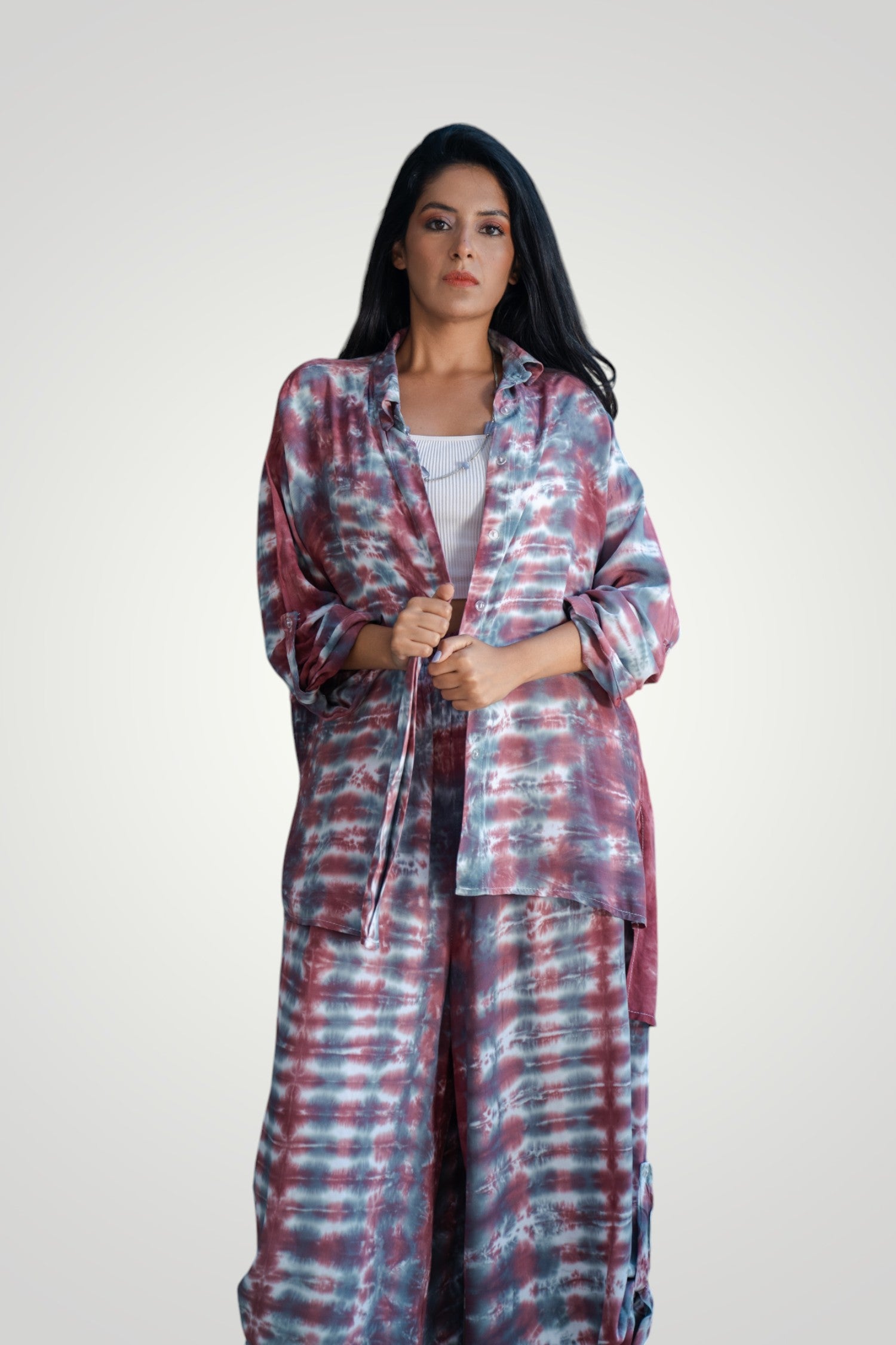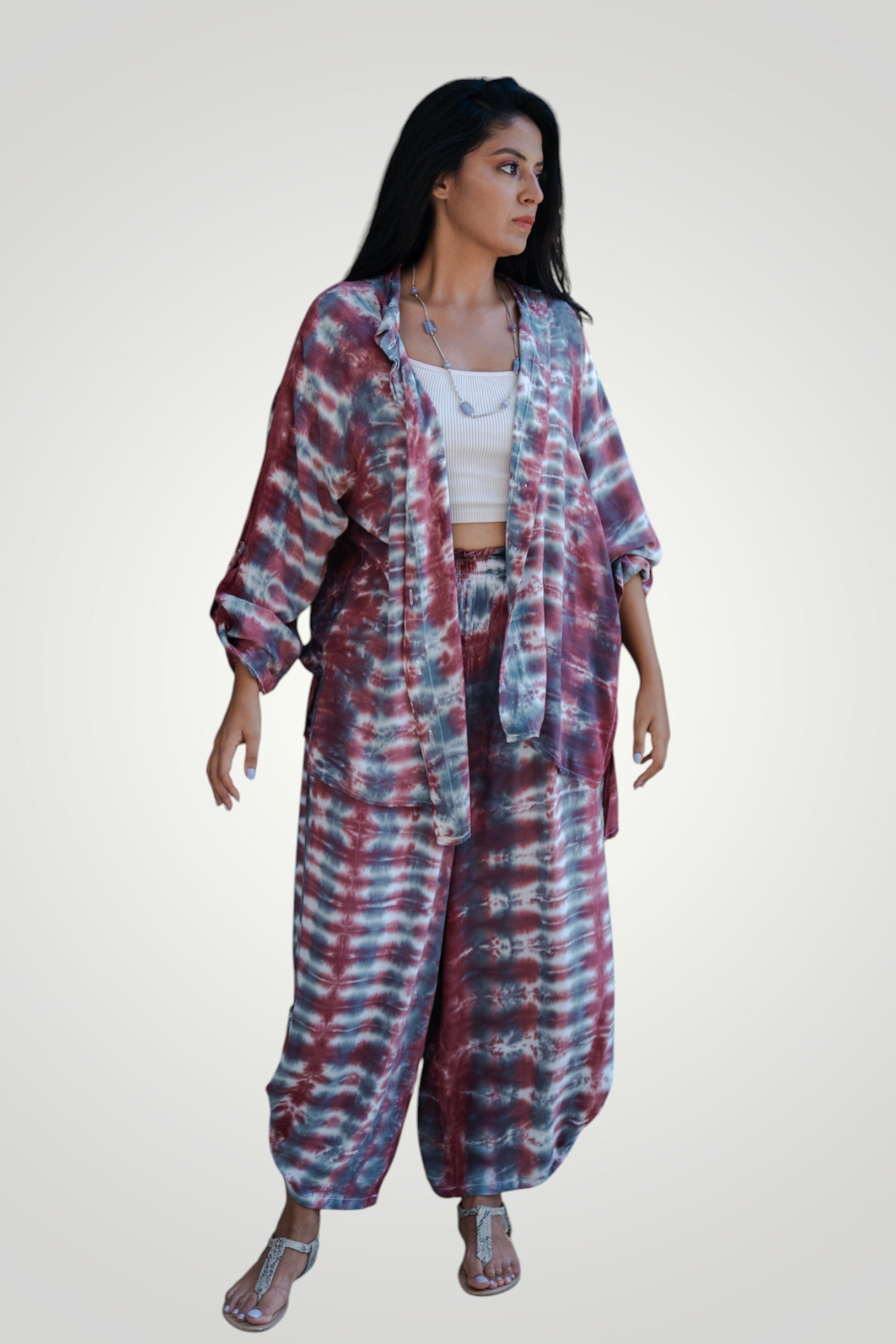 Hand tie dyed set, pants with elastic adjustable waist and shirt with front buttons