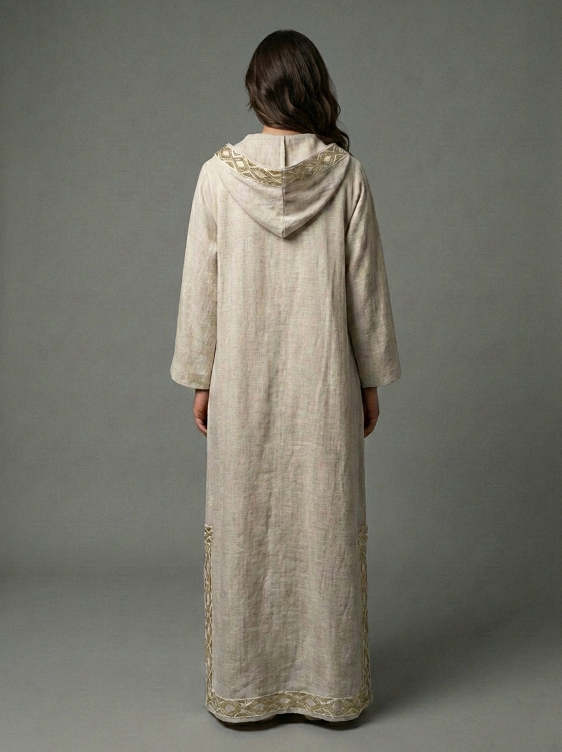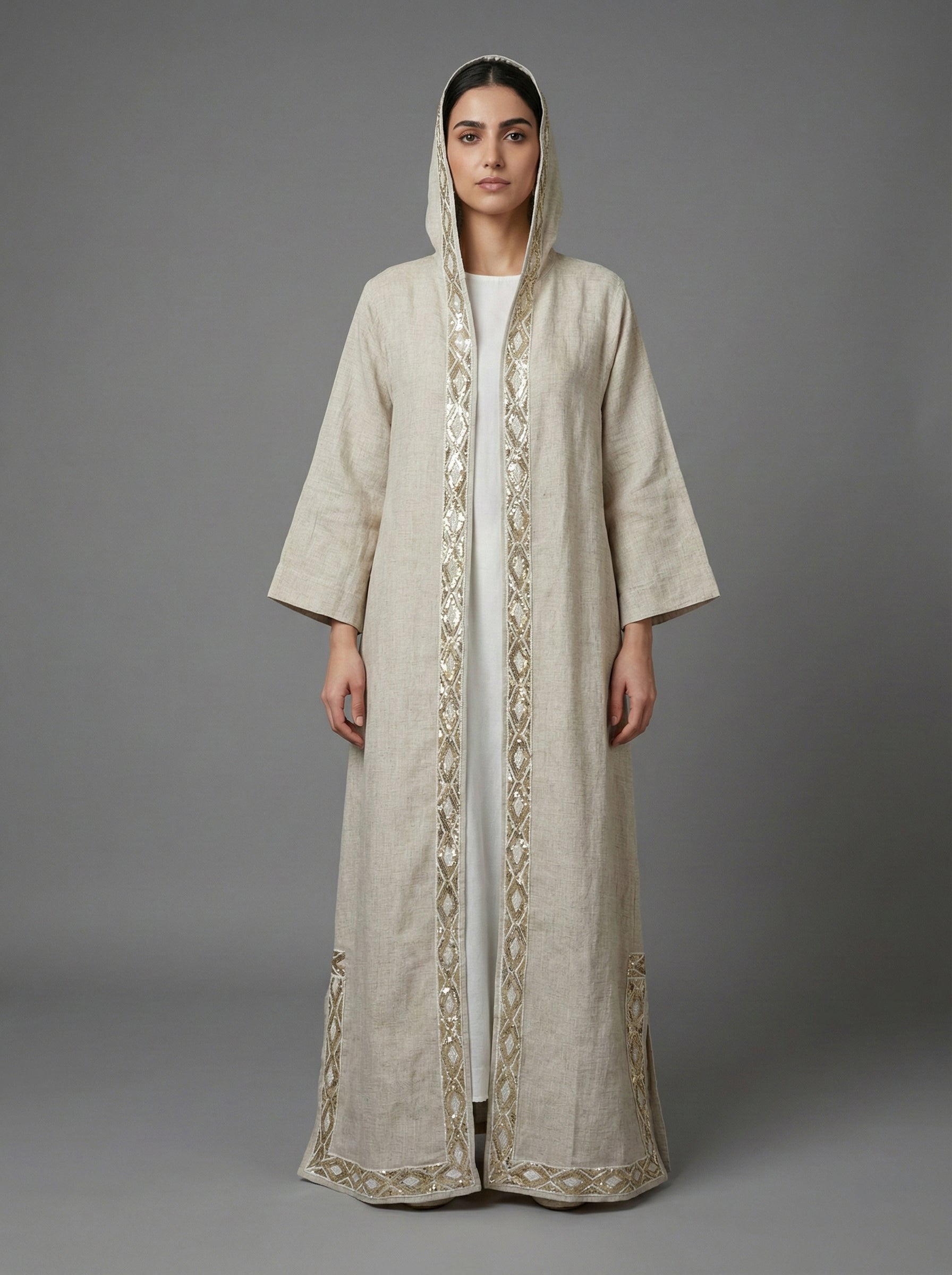 • Full gold kolfa detailing around the front opening, hood, sleeves, and hem for a luxurious finish