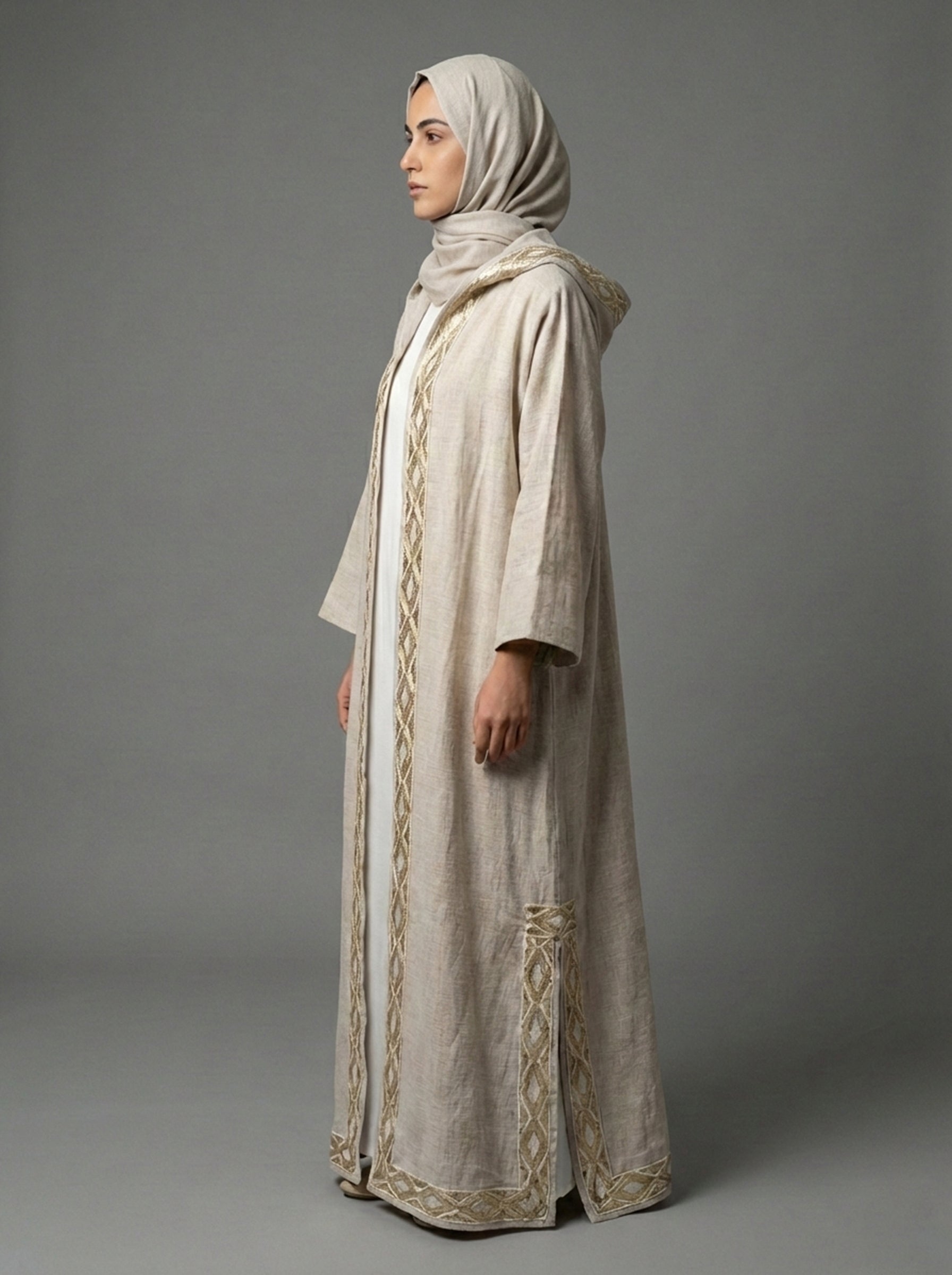 • كُلفة ذهبية فاخرة محيطة بالعباية بالكامل من الأمام، الكابيشو، الأكمام والحافة