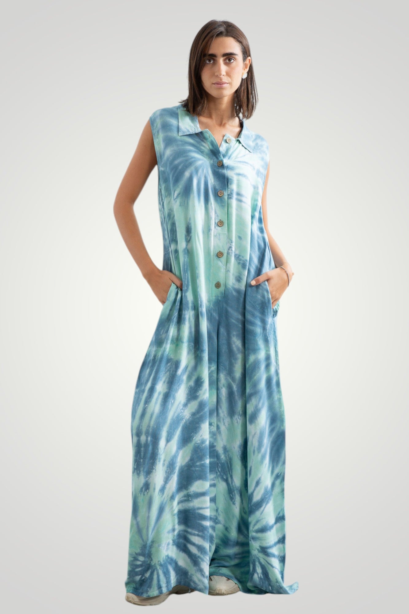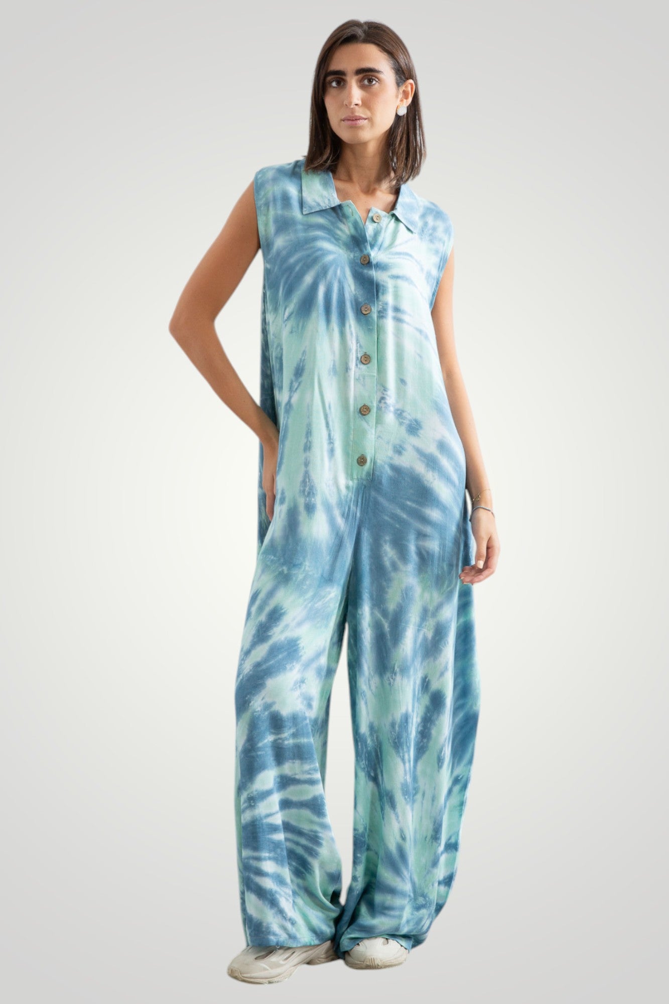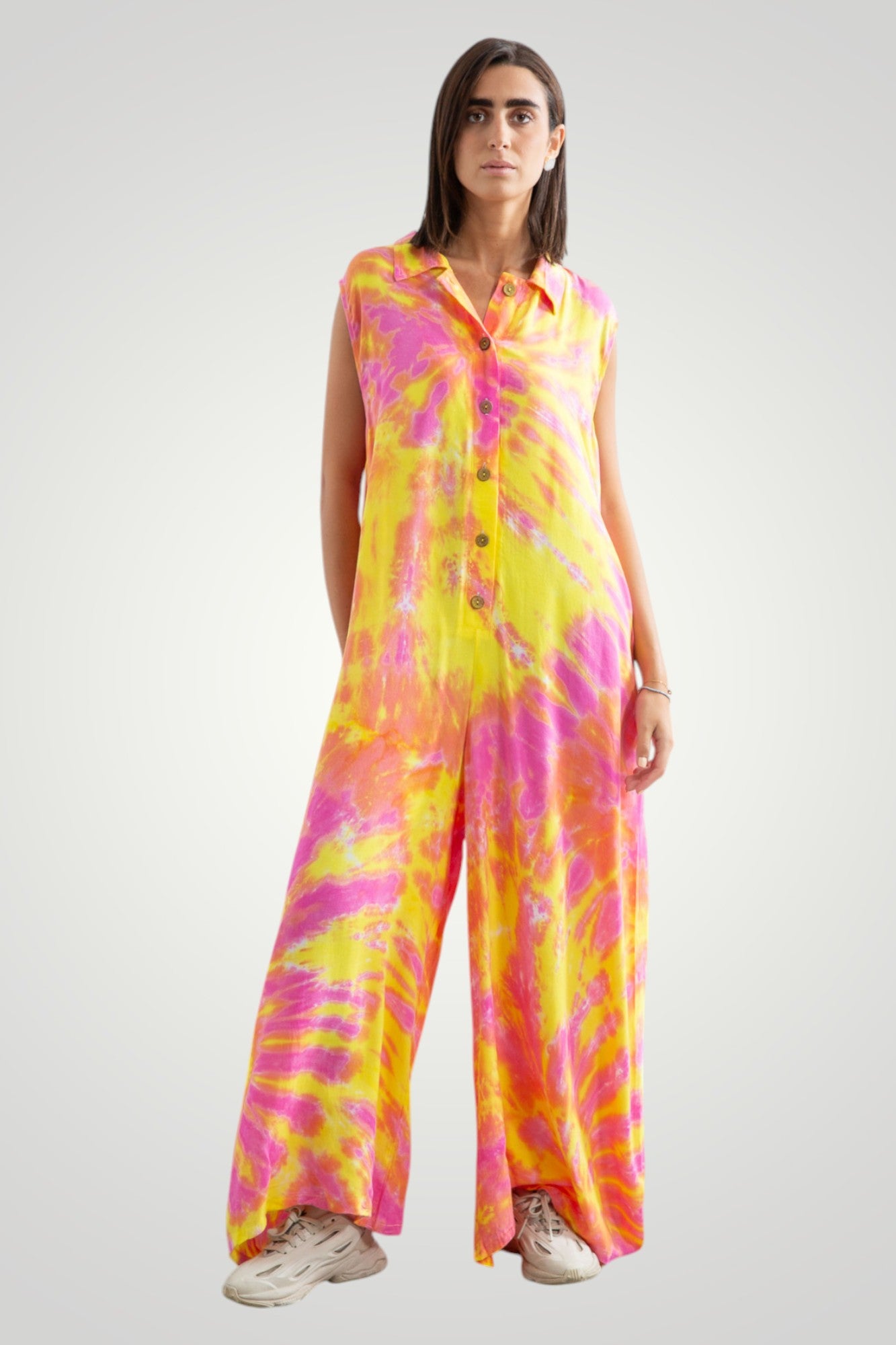 hand tie dyed jumpsuit, front wooden buttons, pockets