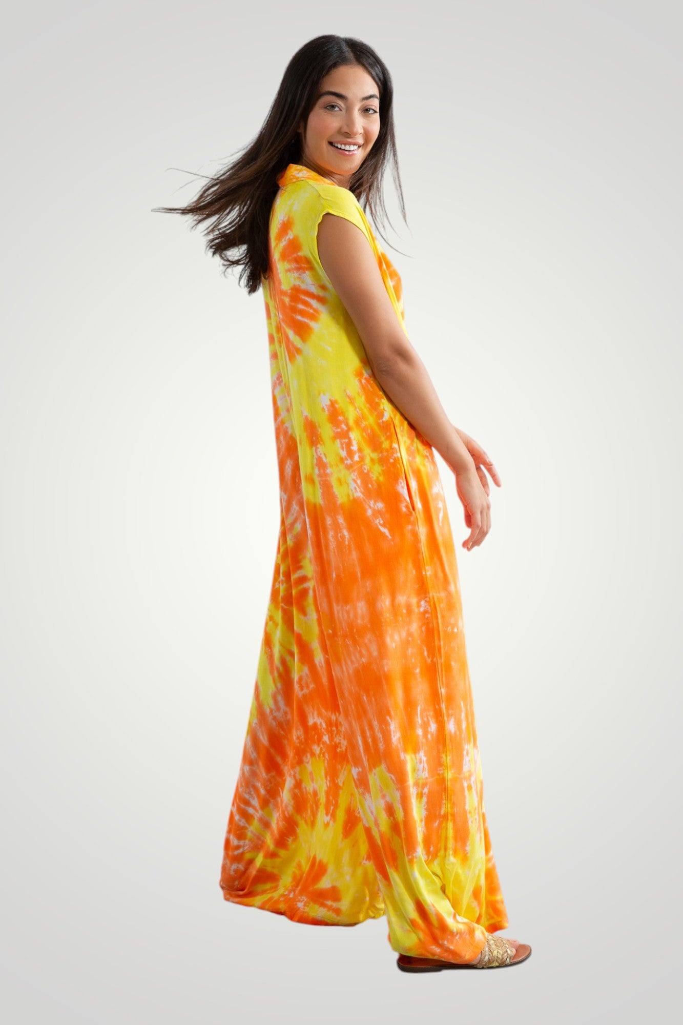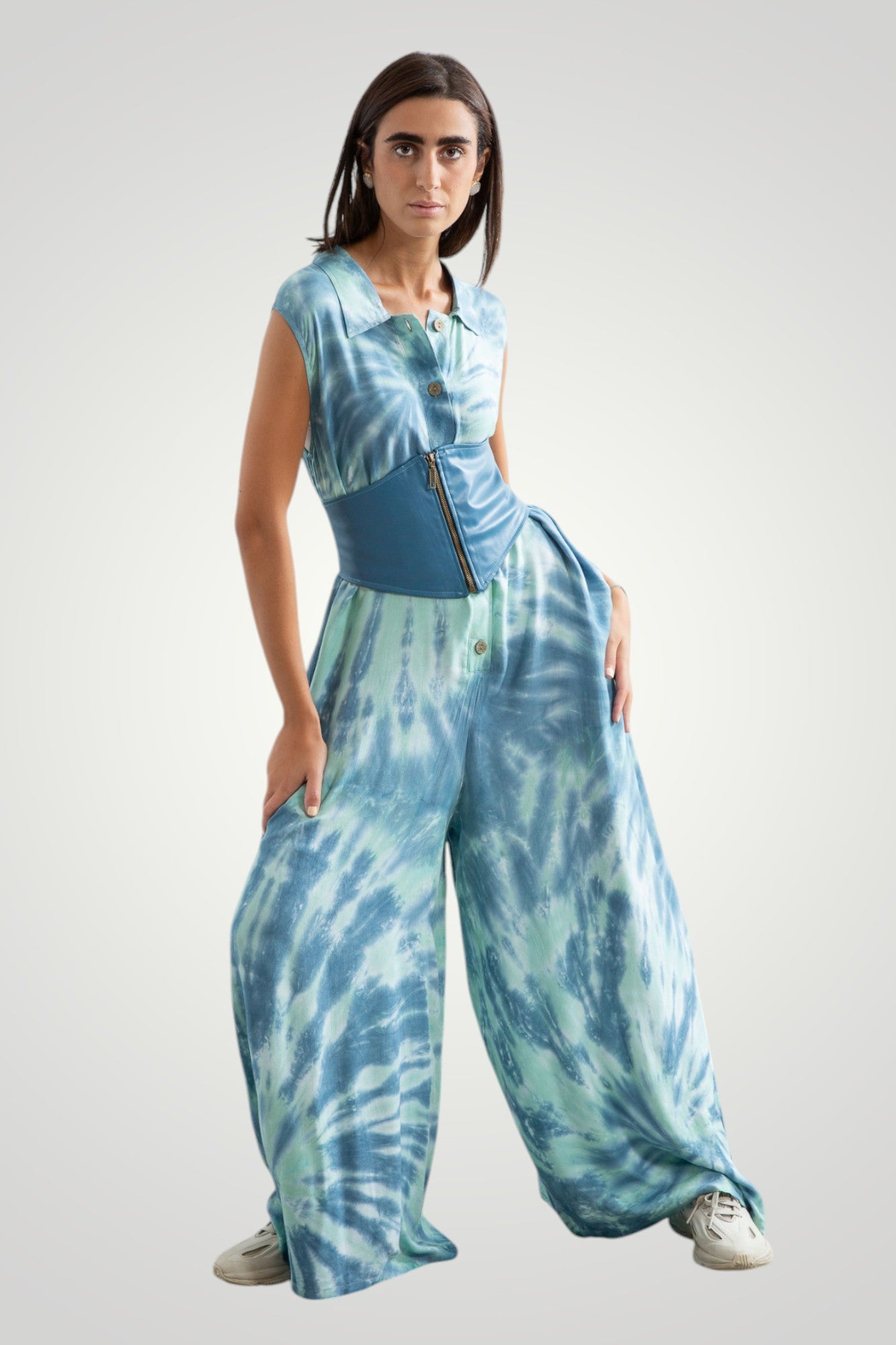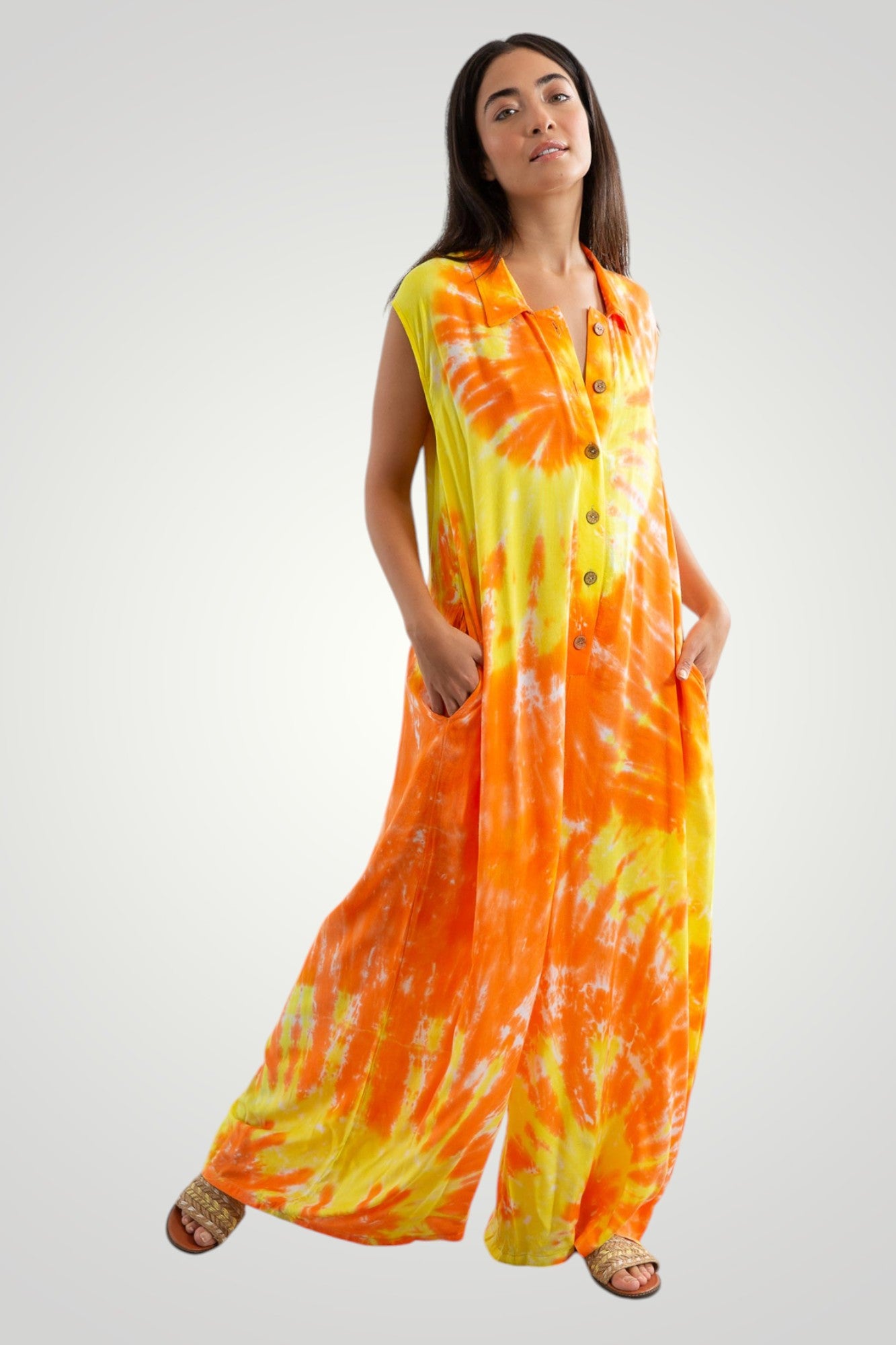 hand tie dyed jumpsuit, front wooden buttons, pockets