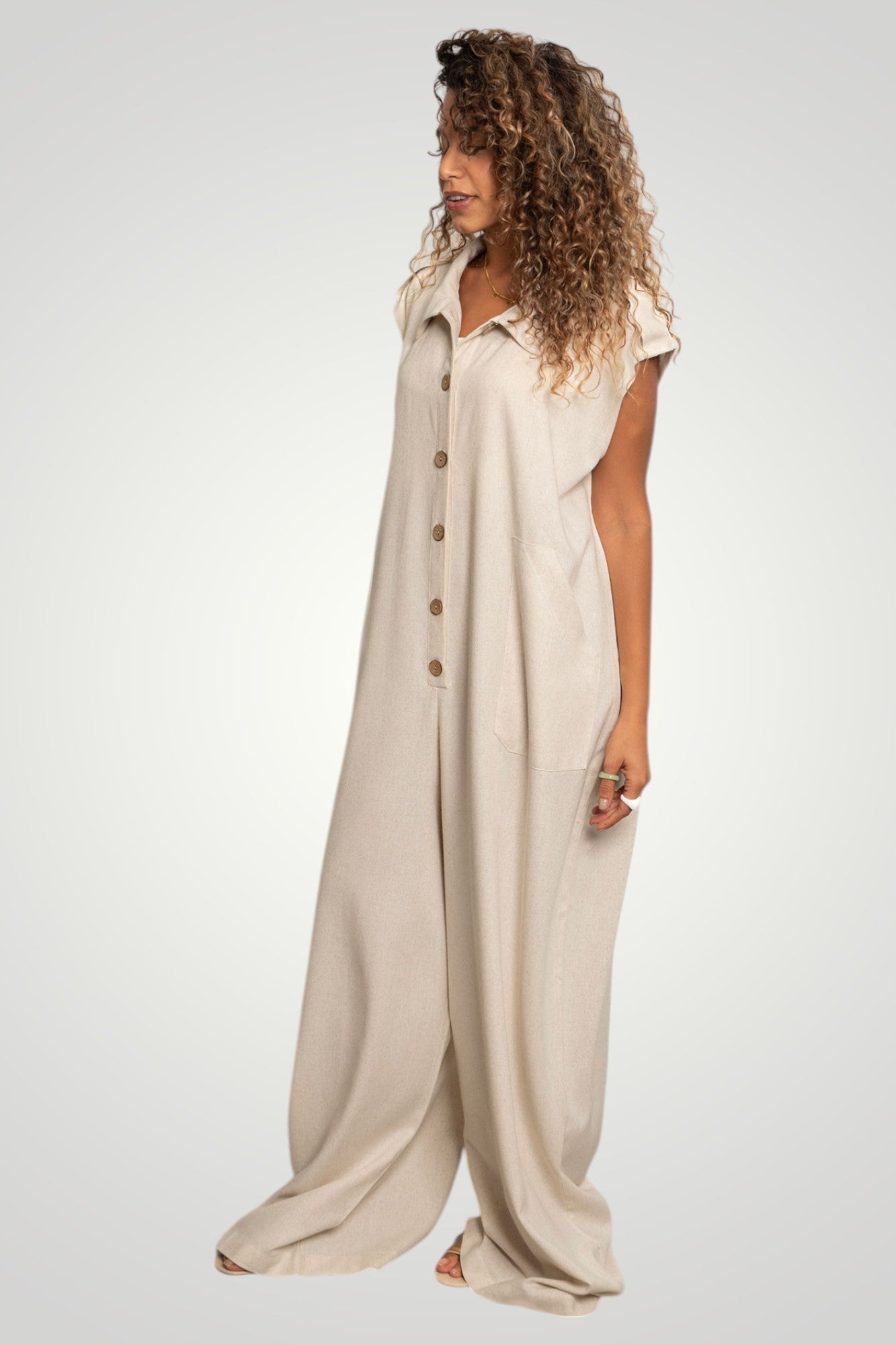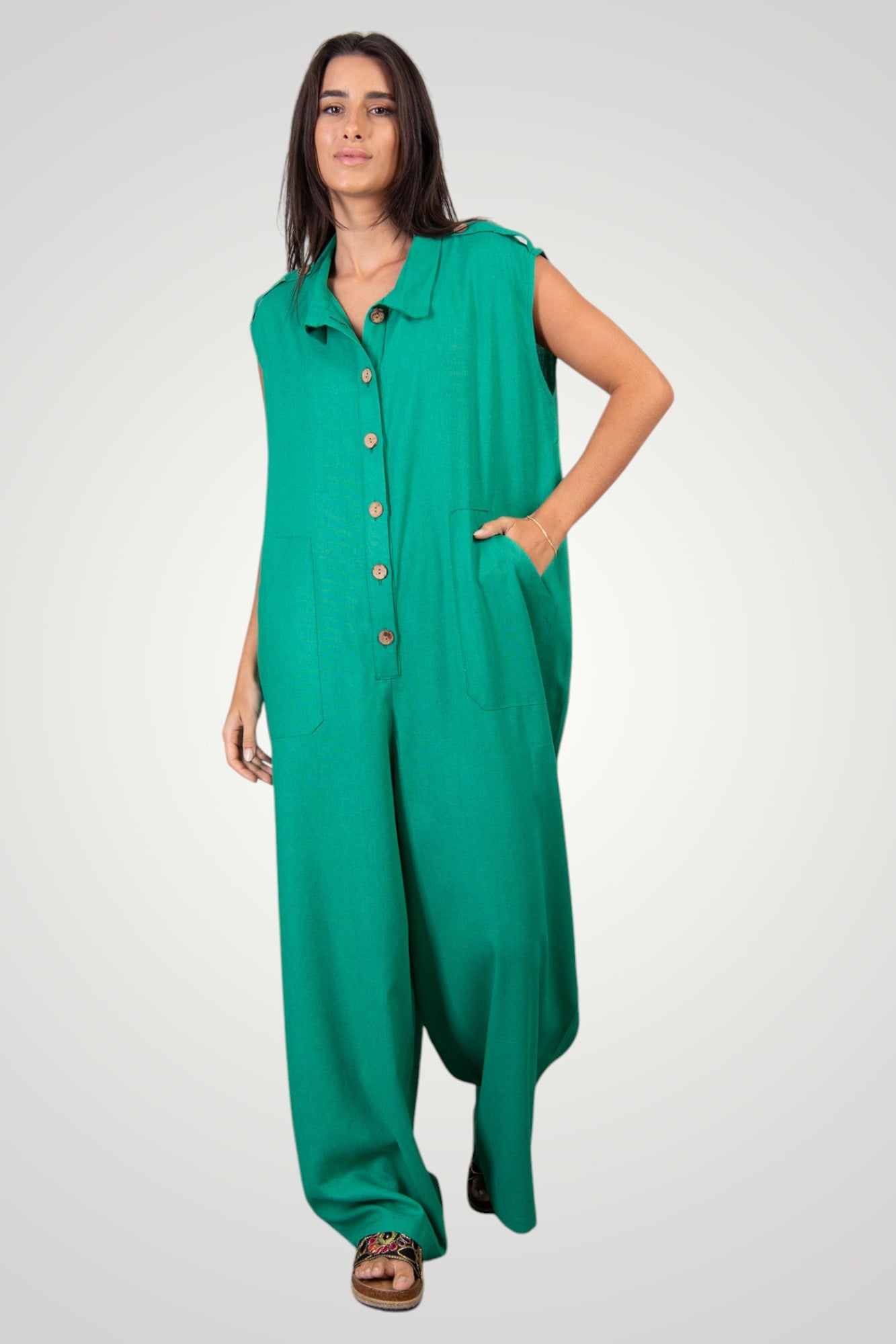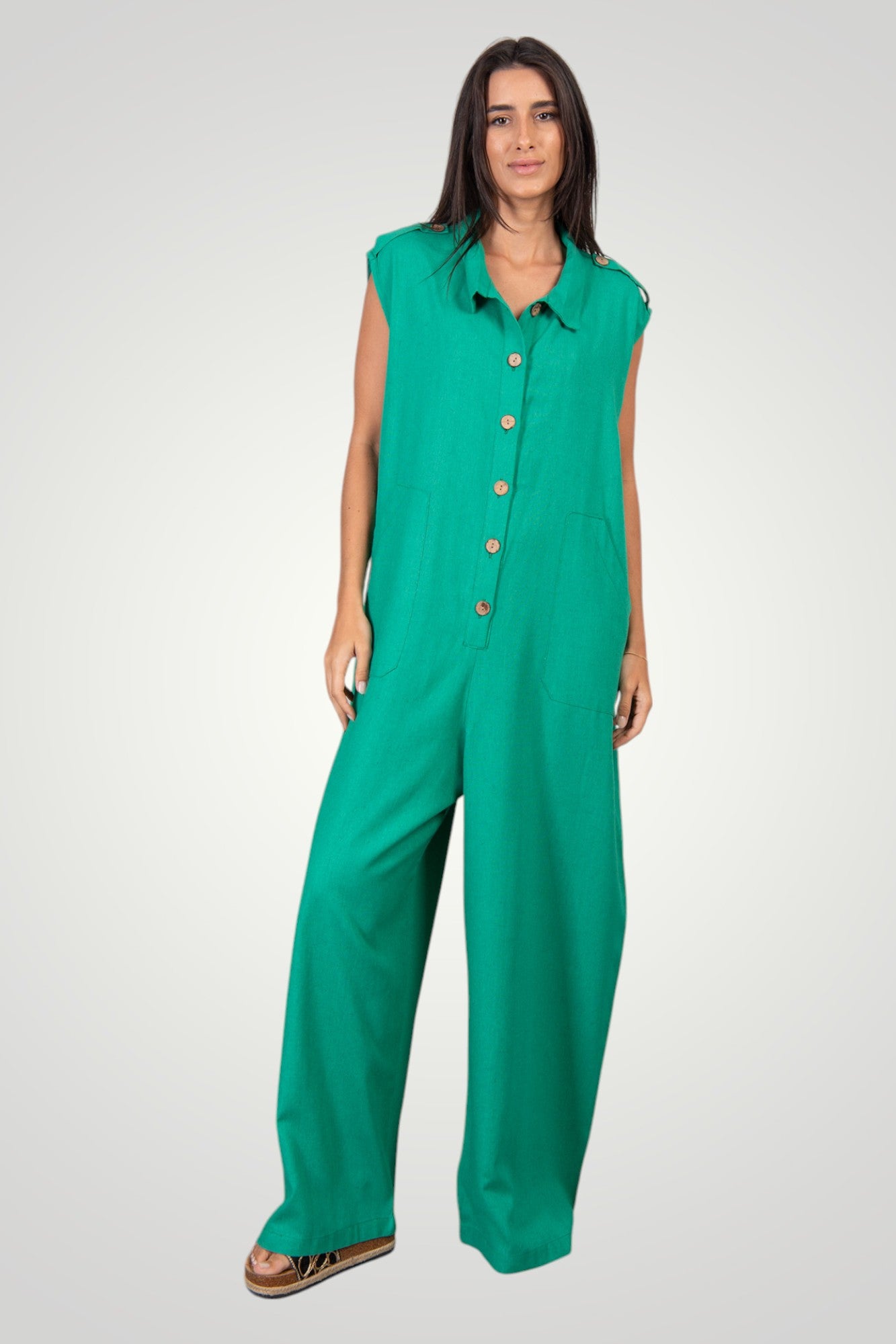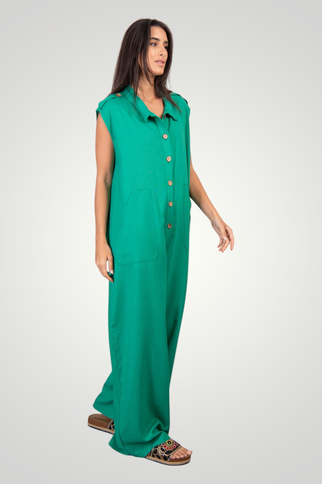a perfect one piece outfit, jumpsuit with color and wooden buttons, front pockets