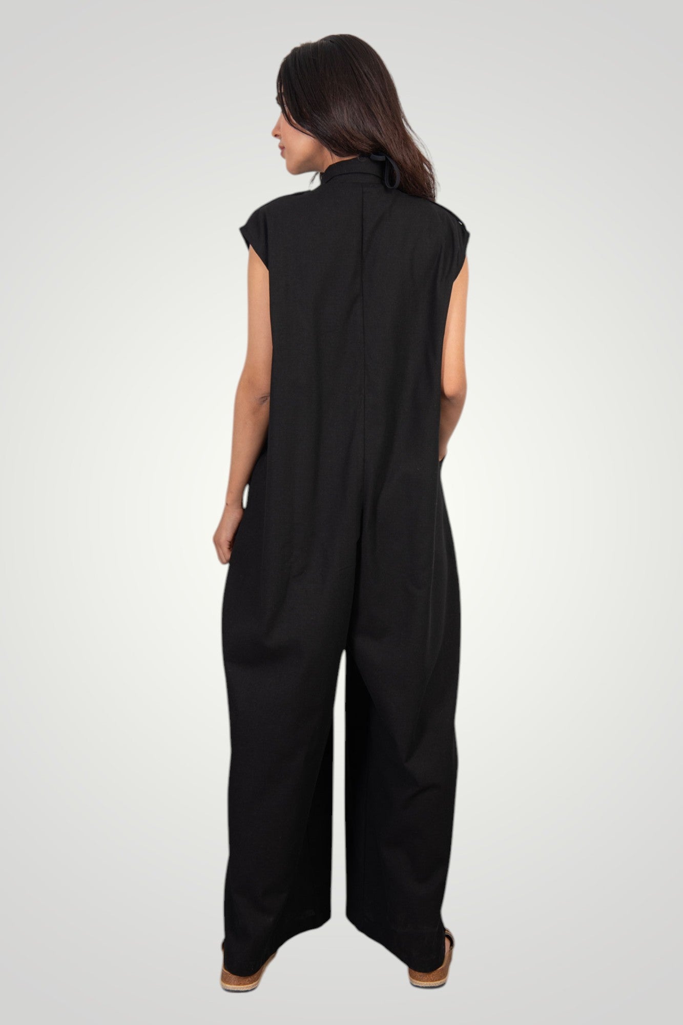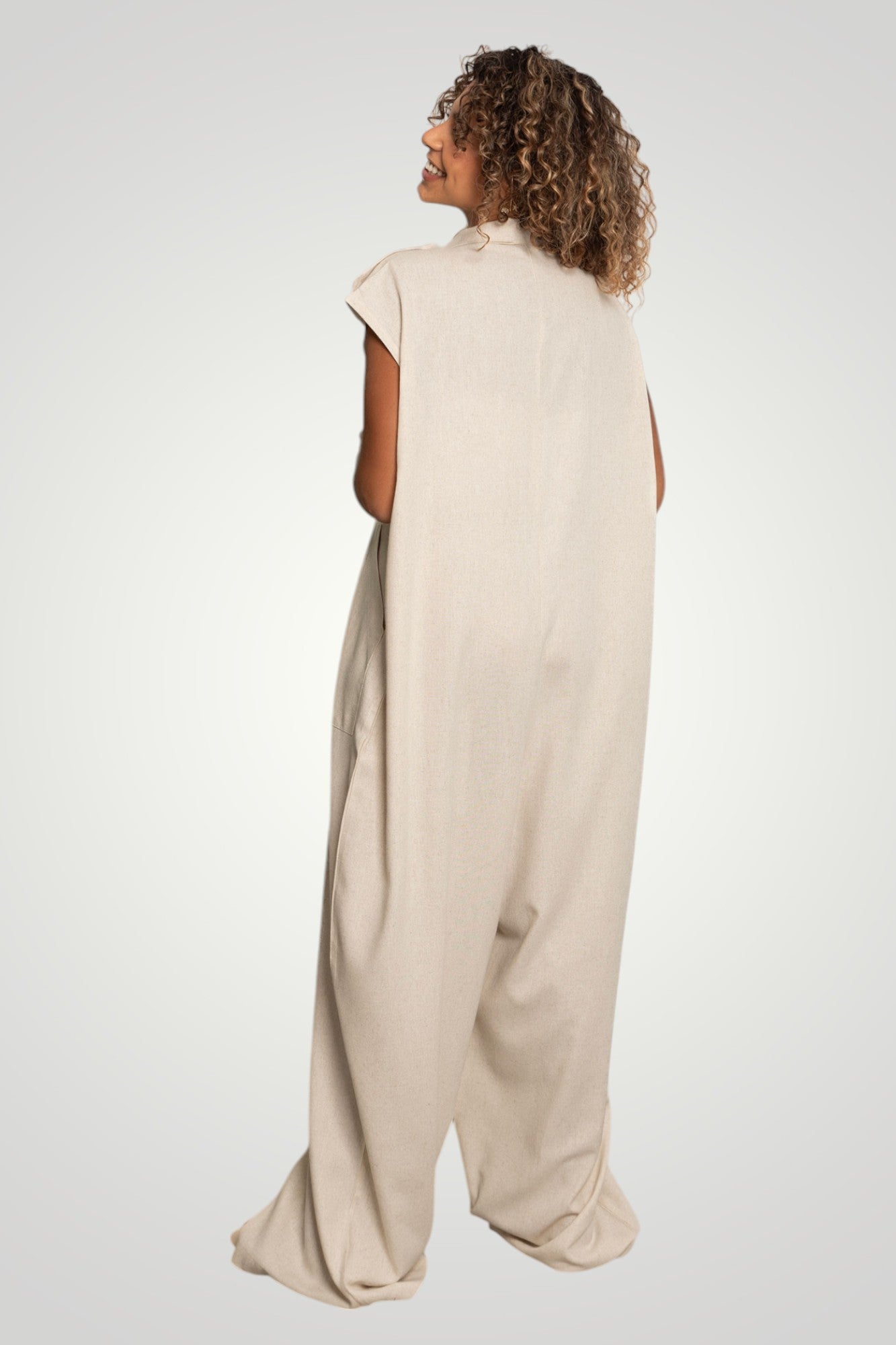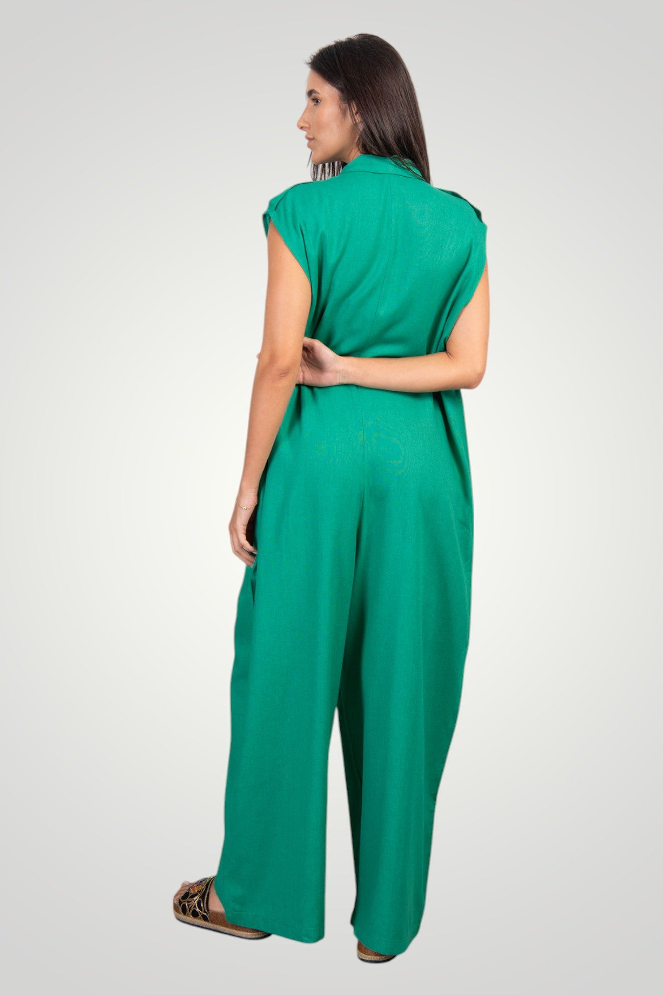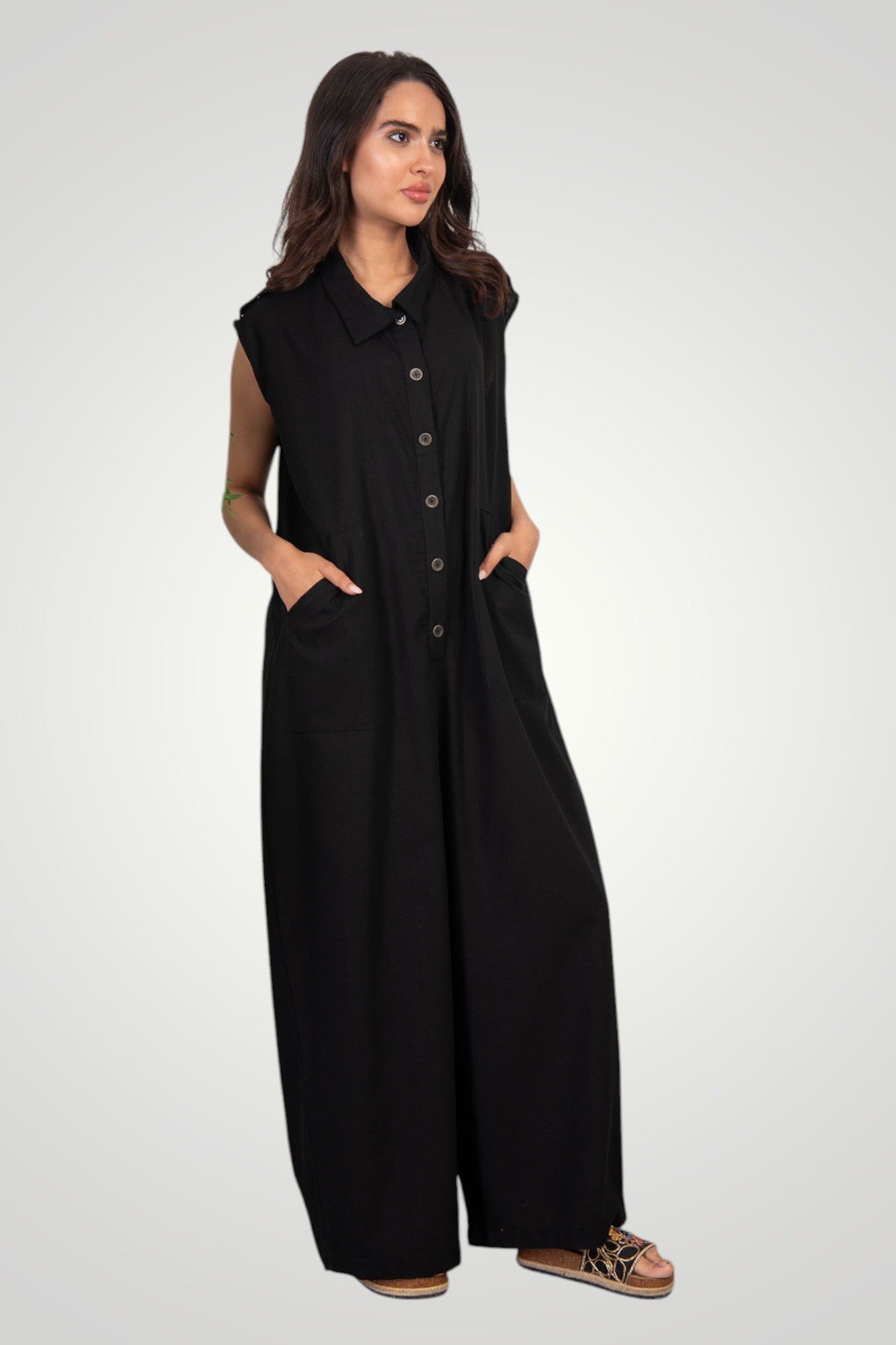 a perfect one piece outfit, jumpsuit with color and wooden buttons, front pockets