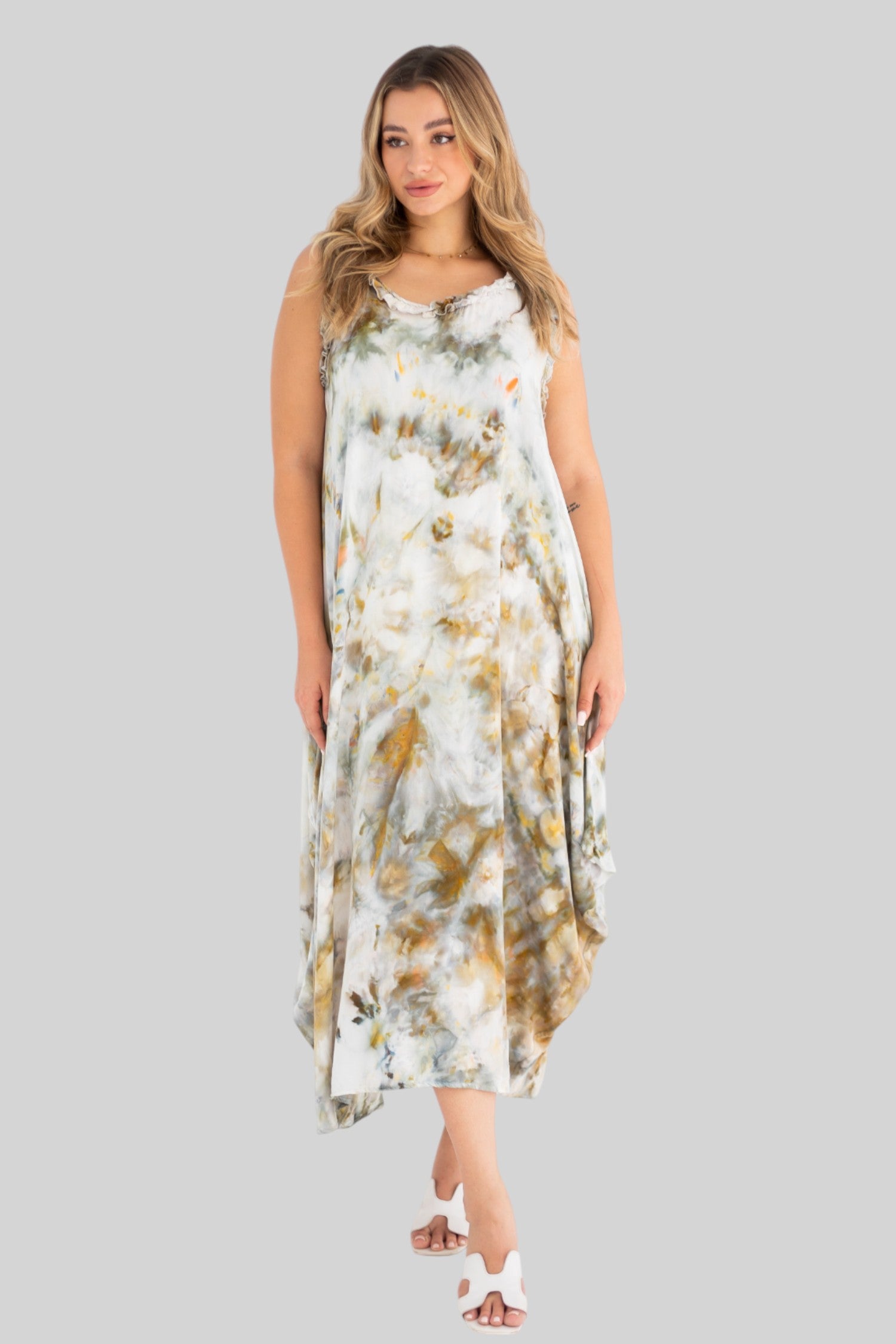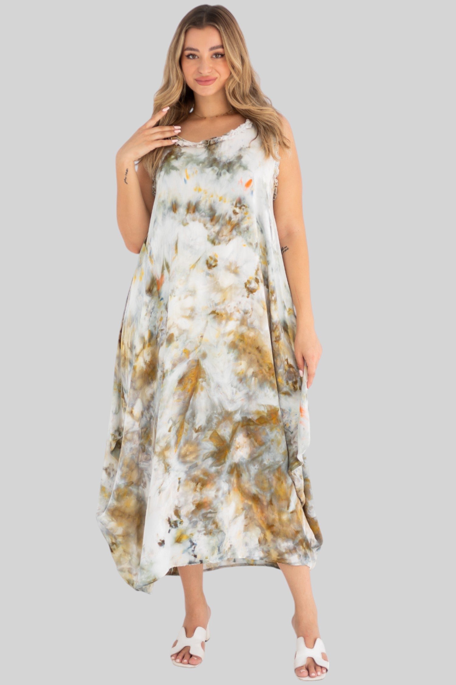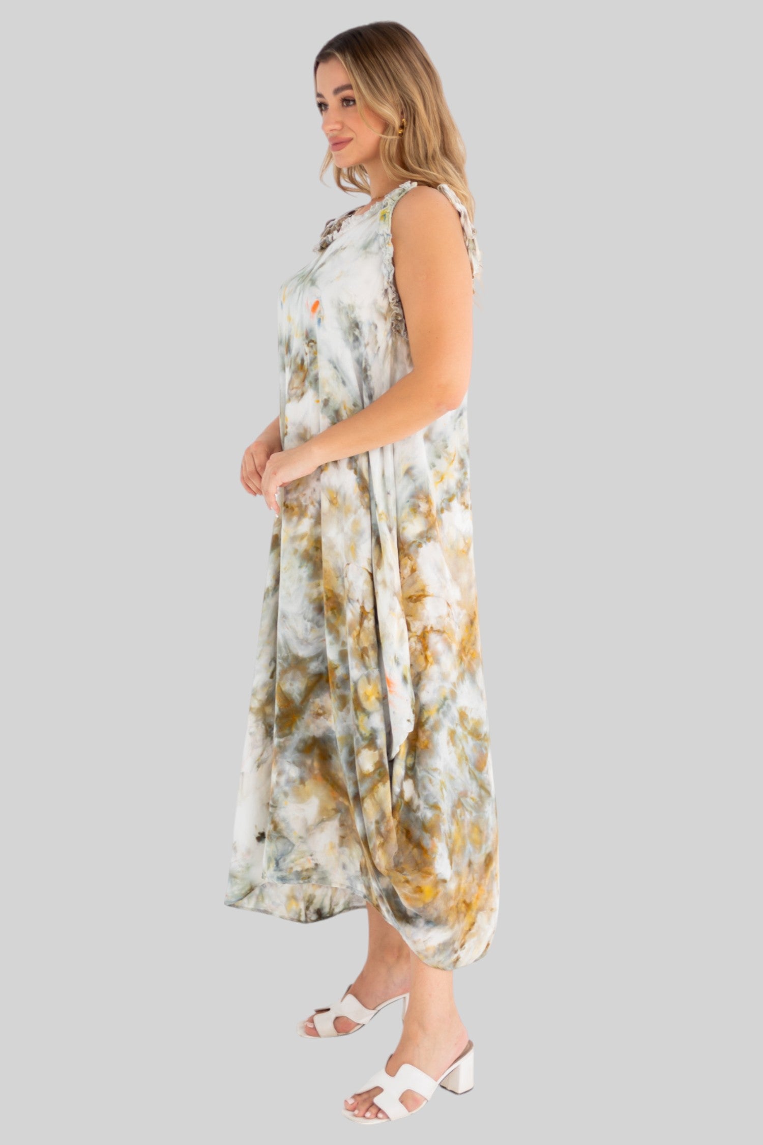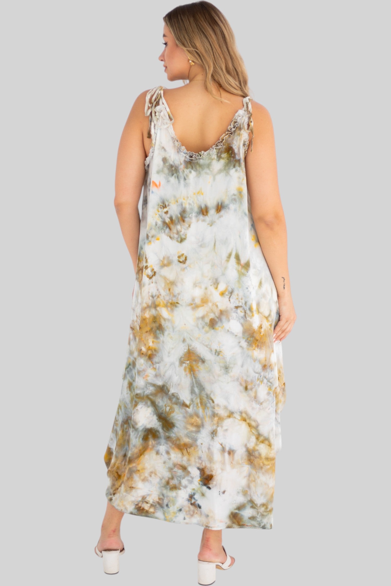 loose dress with adjustable straps, carefully ice tied and dyed by hand