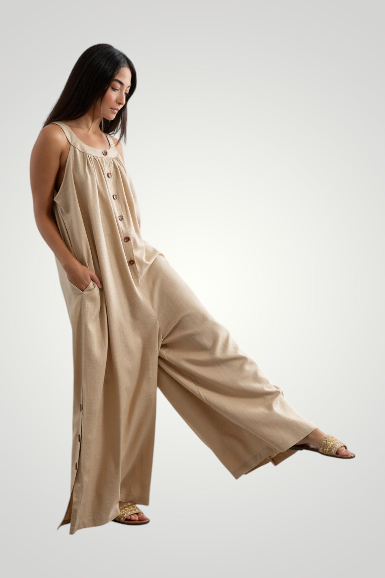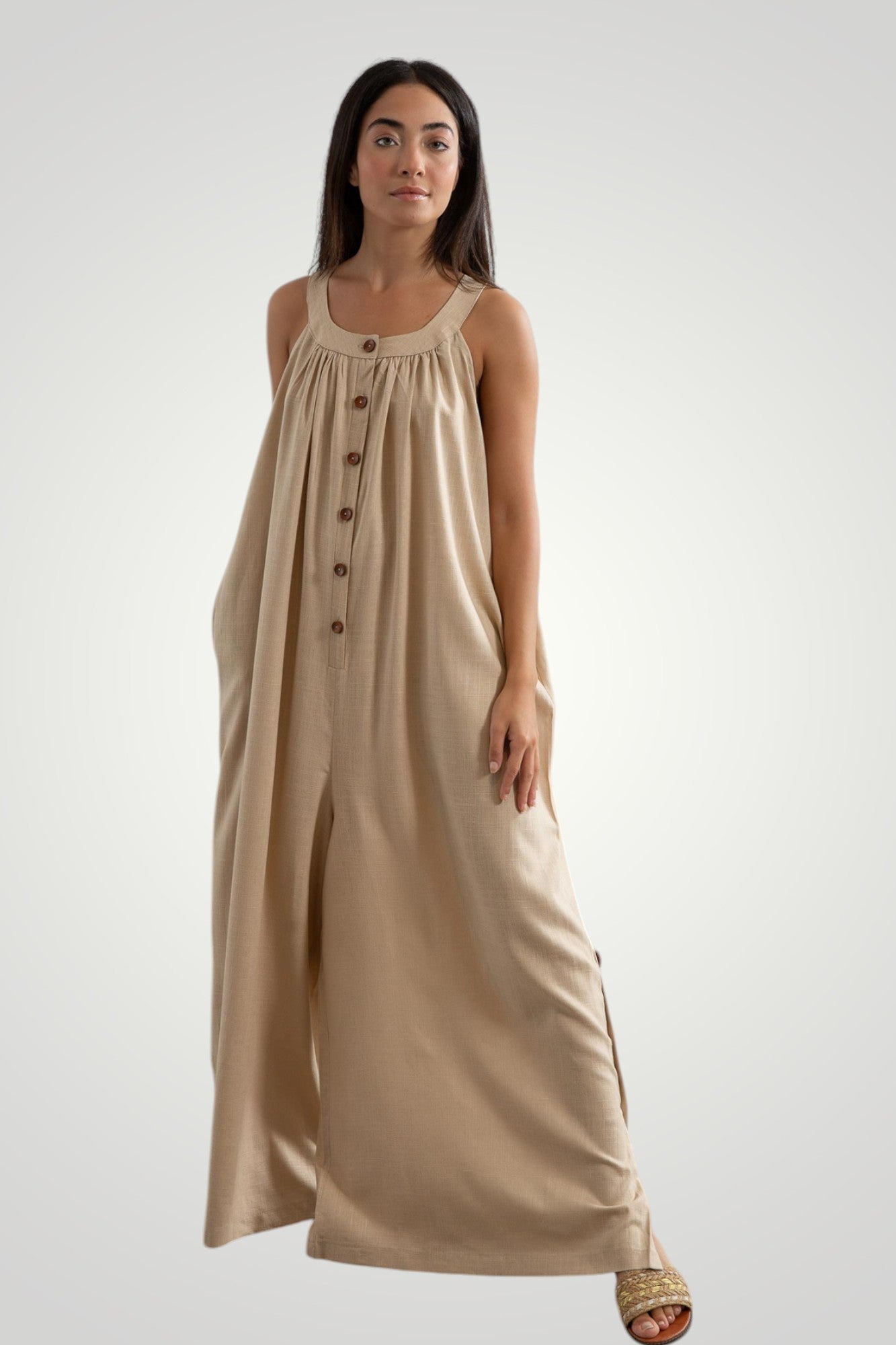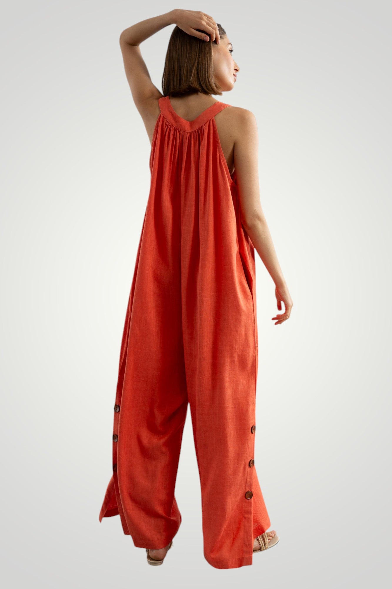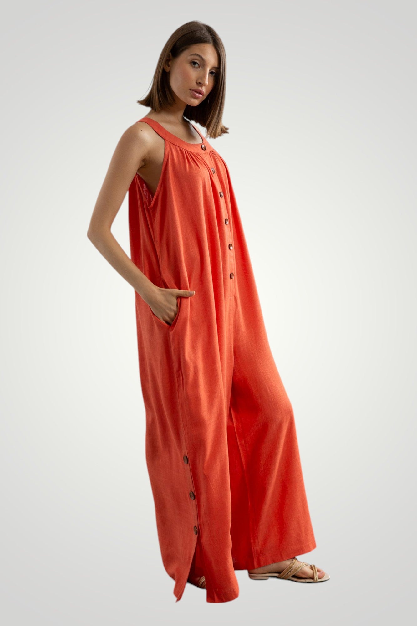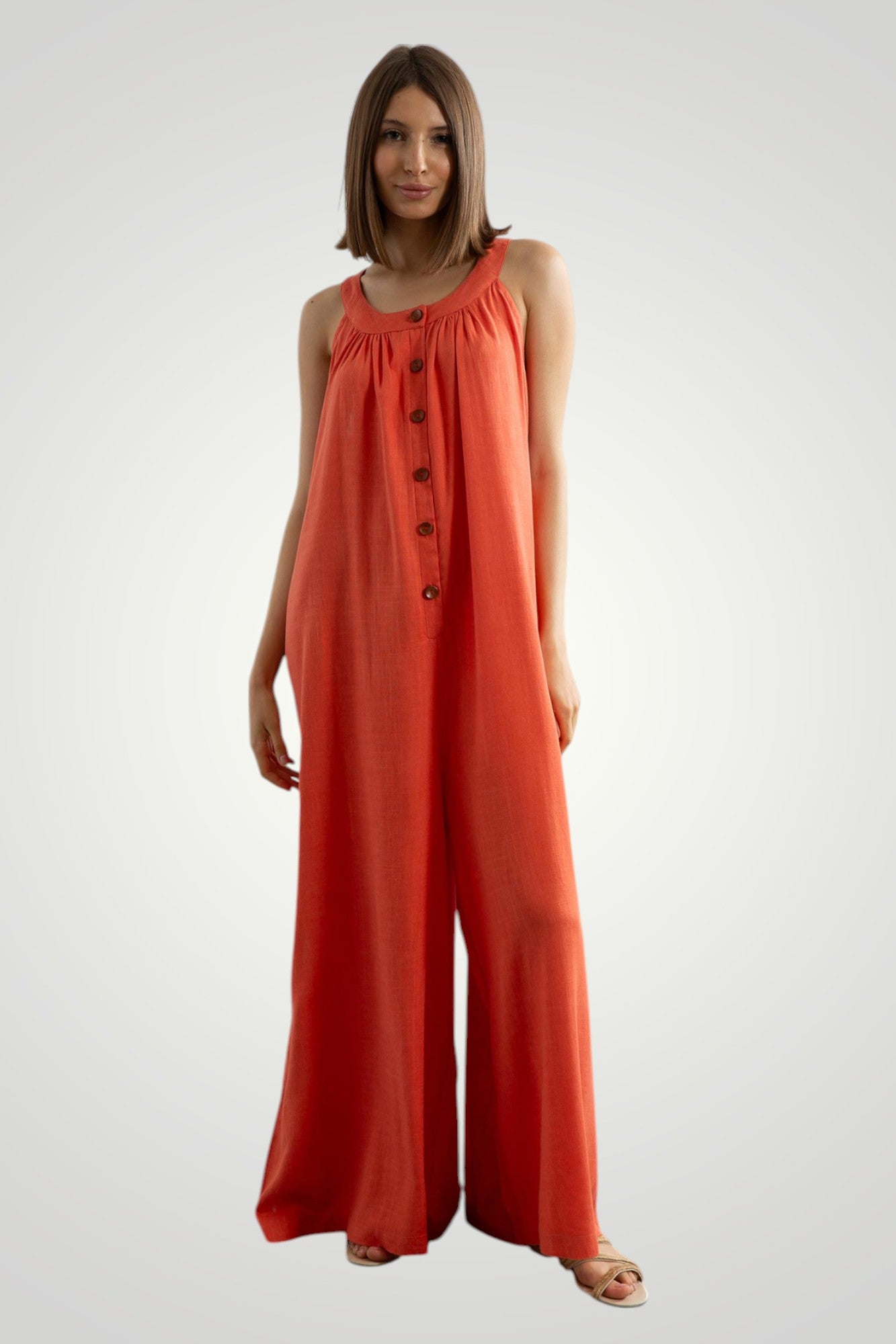 Jumpsuit with rounded neckline, front and side buttons, pockets