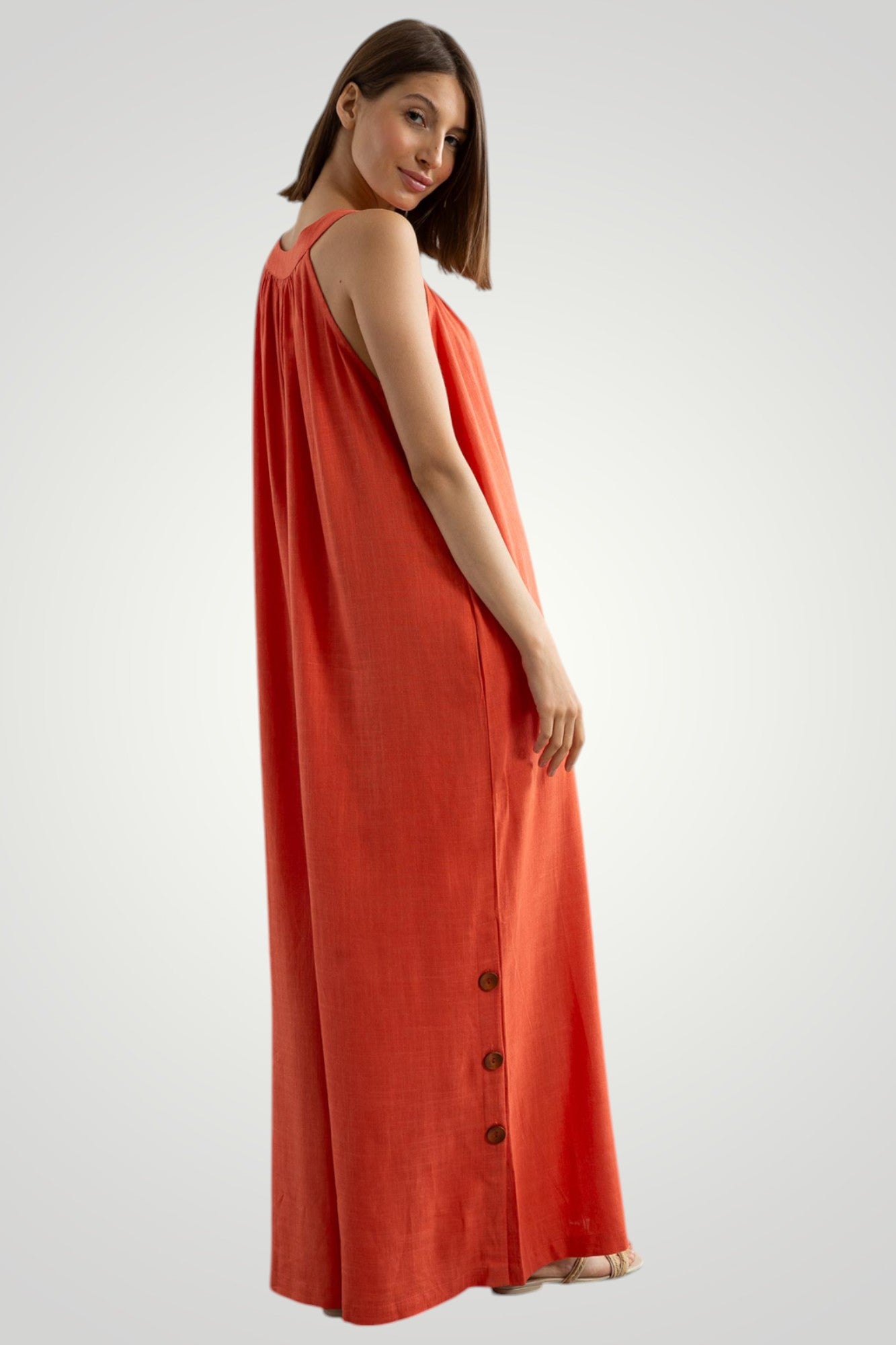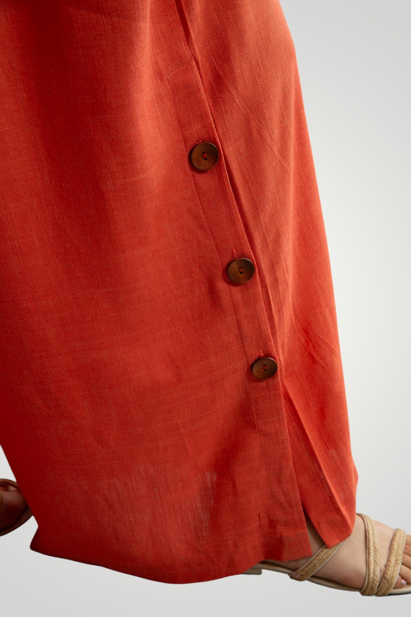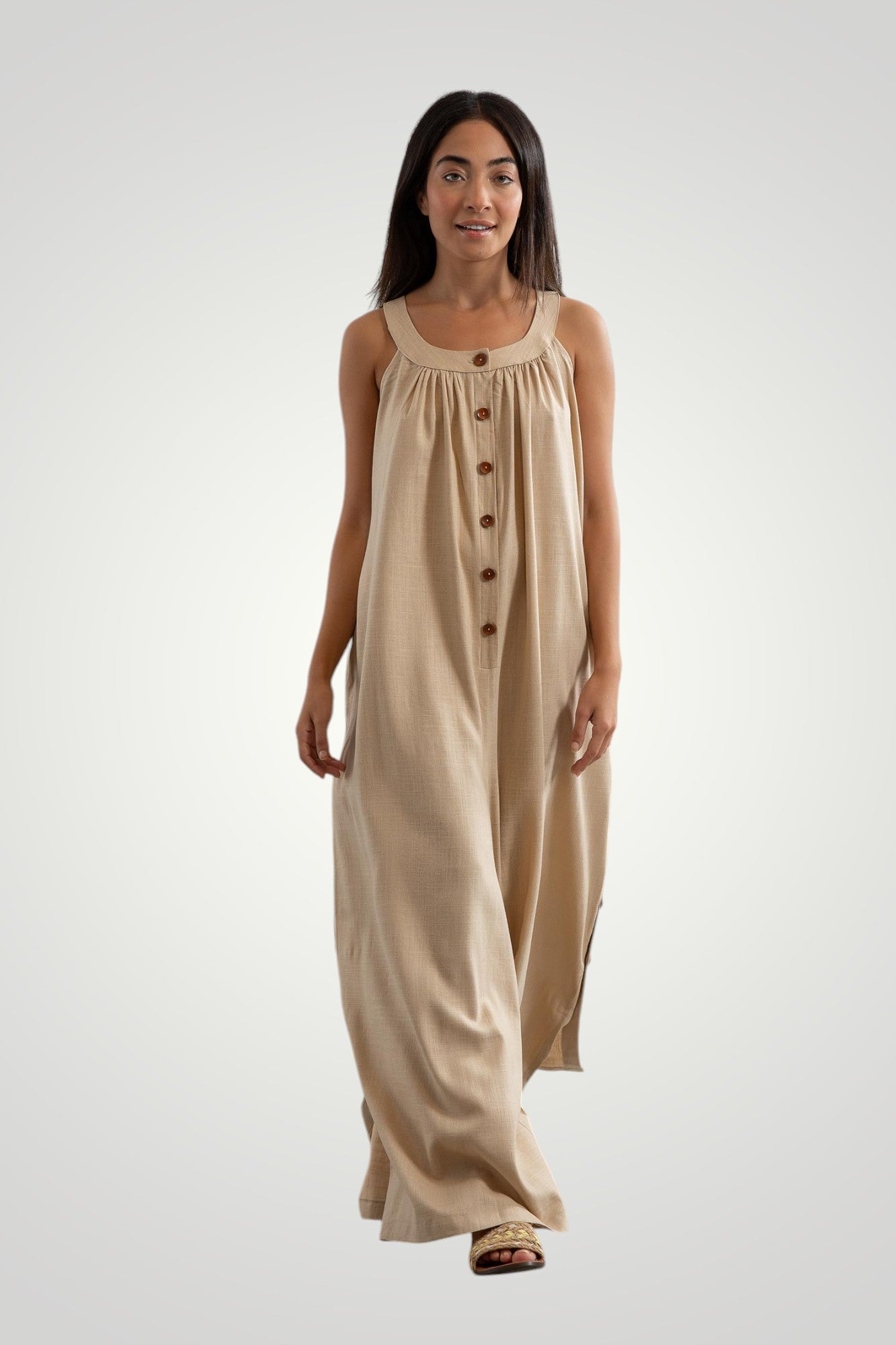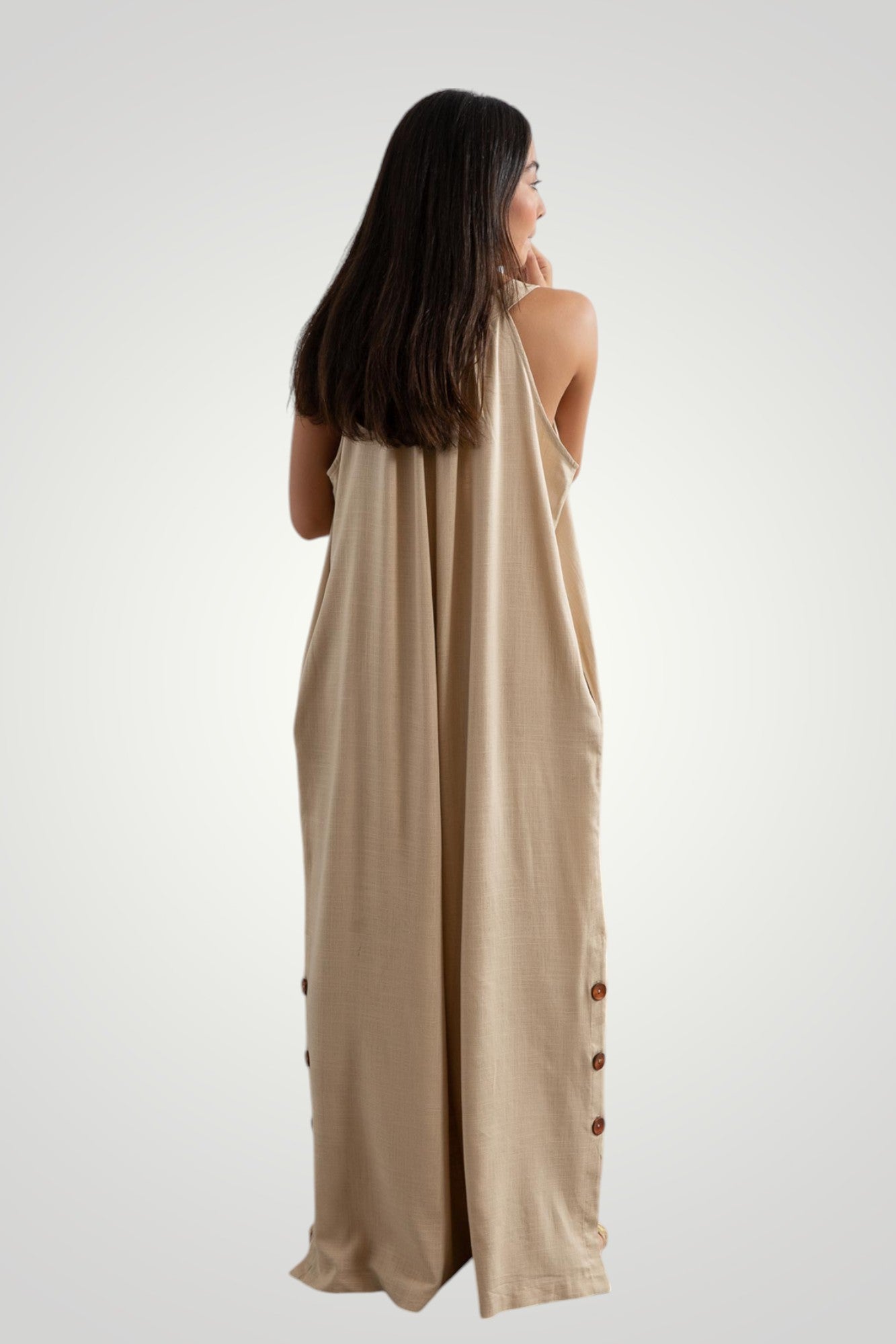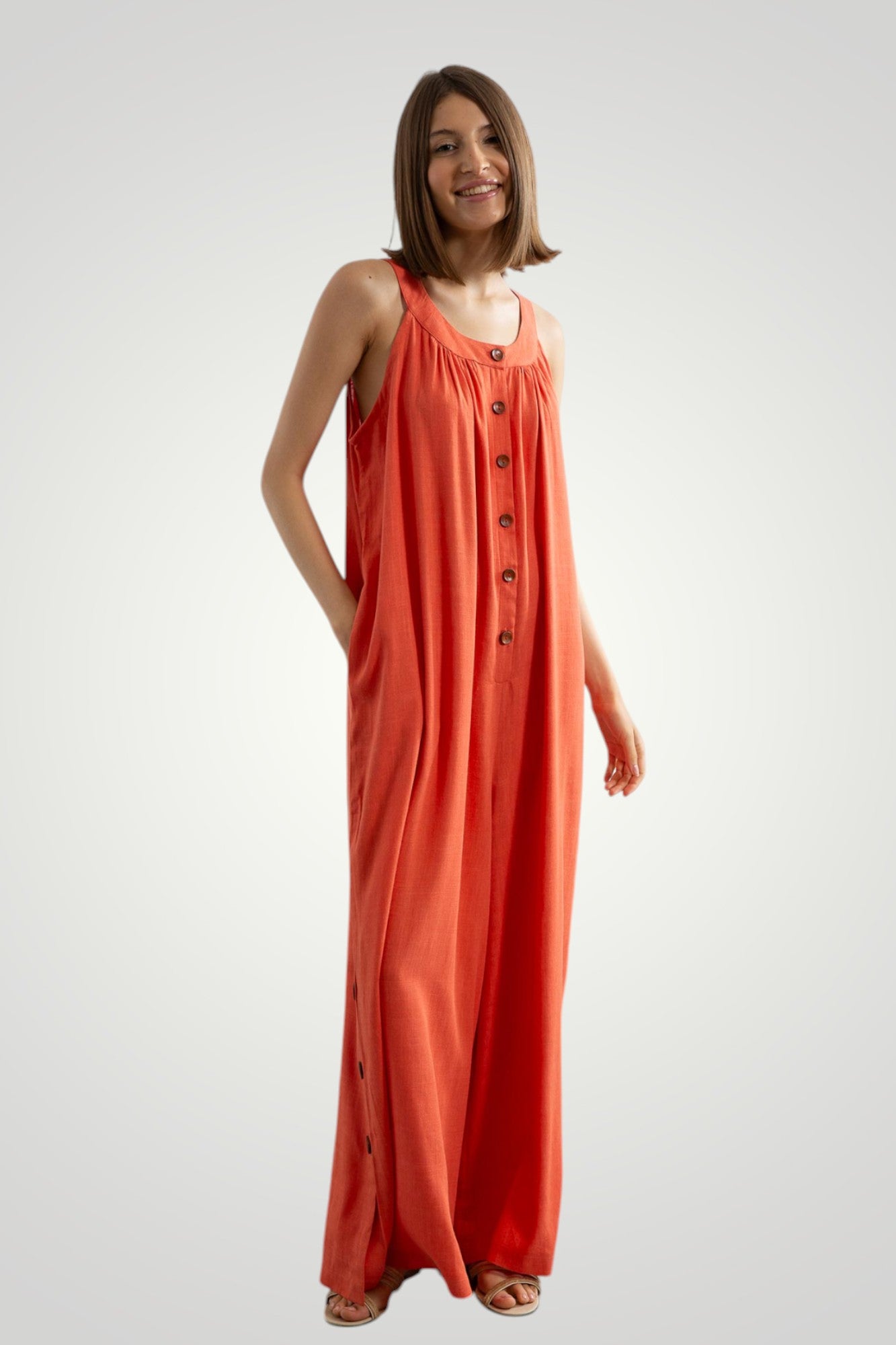 Jumpsuit with rounded neckline, front and side buttons, pockets