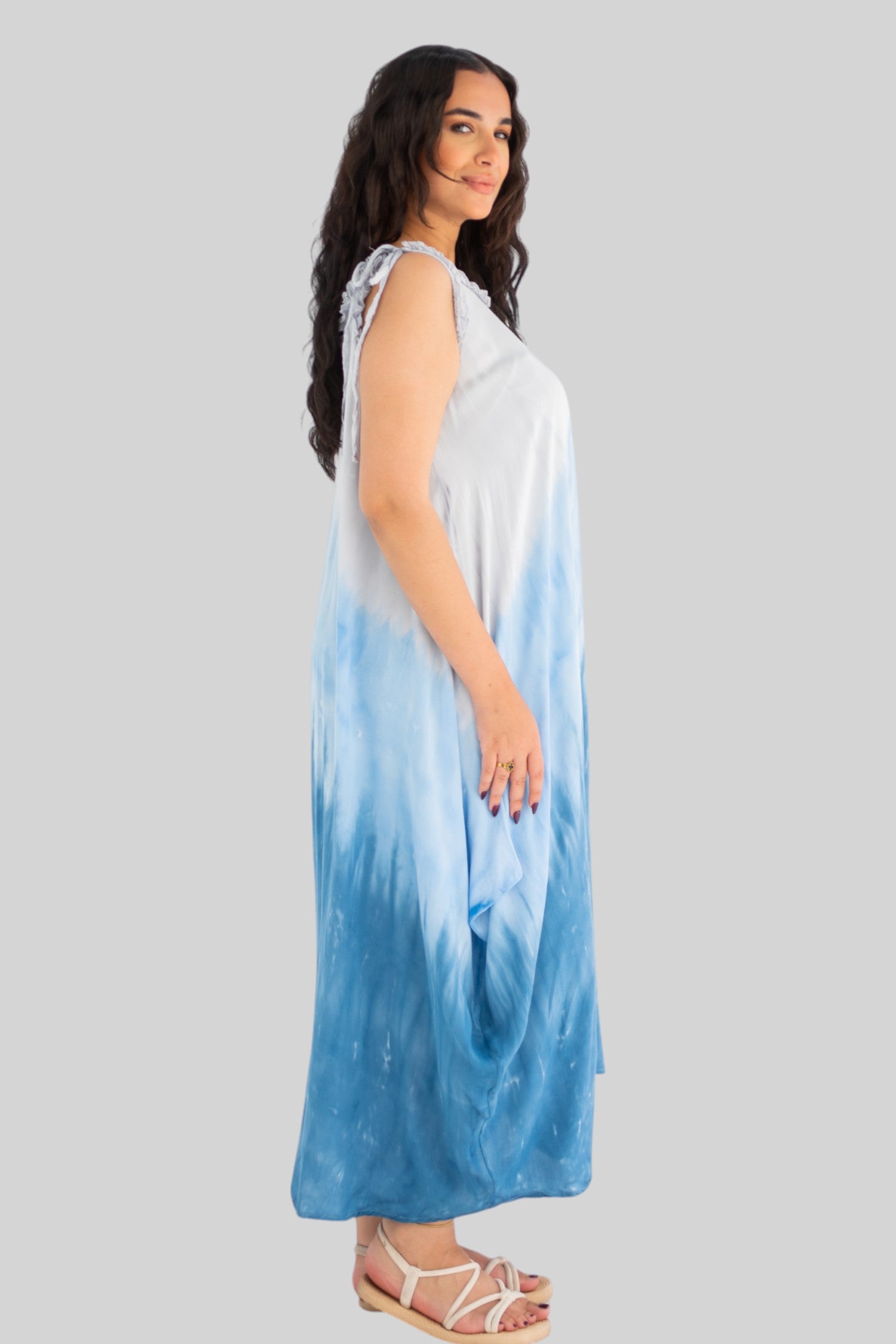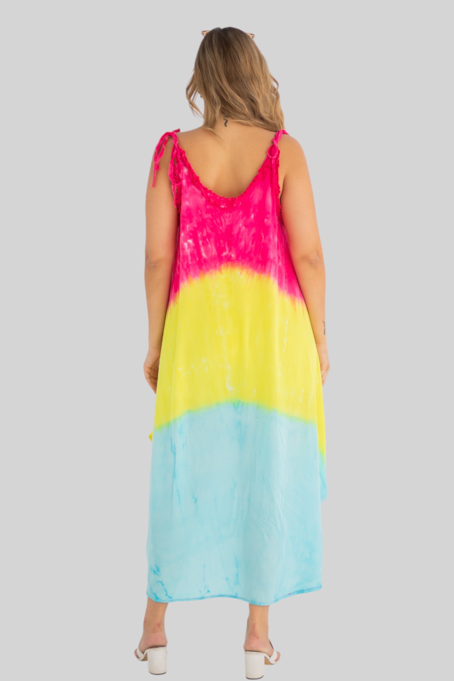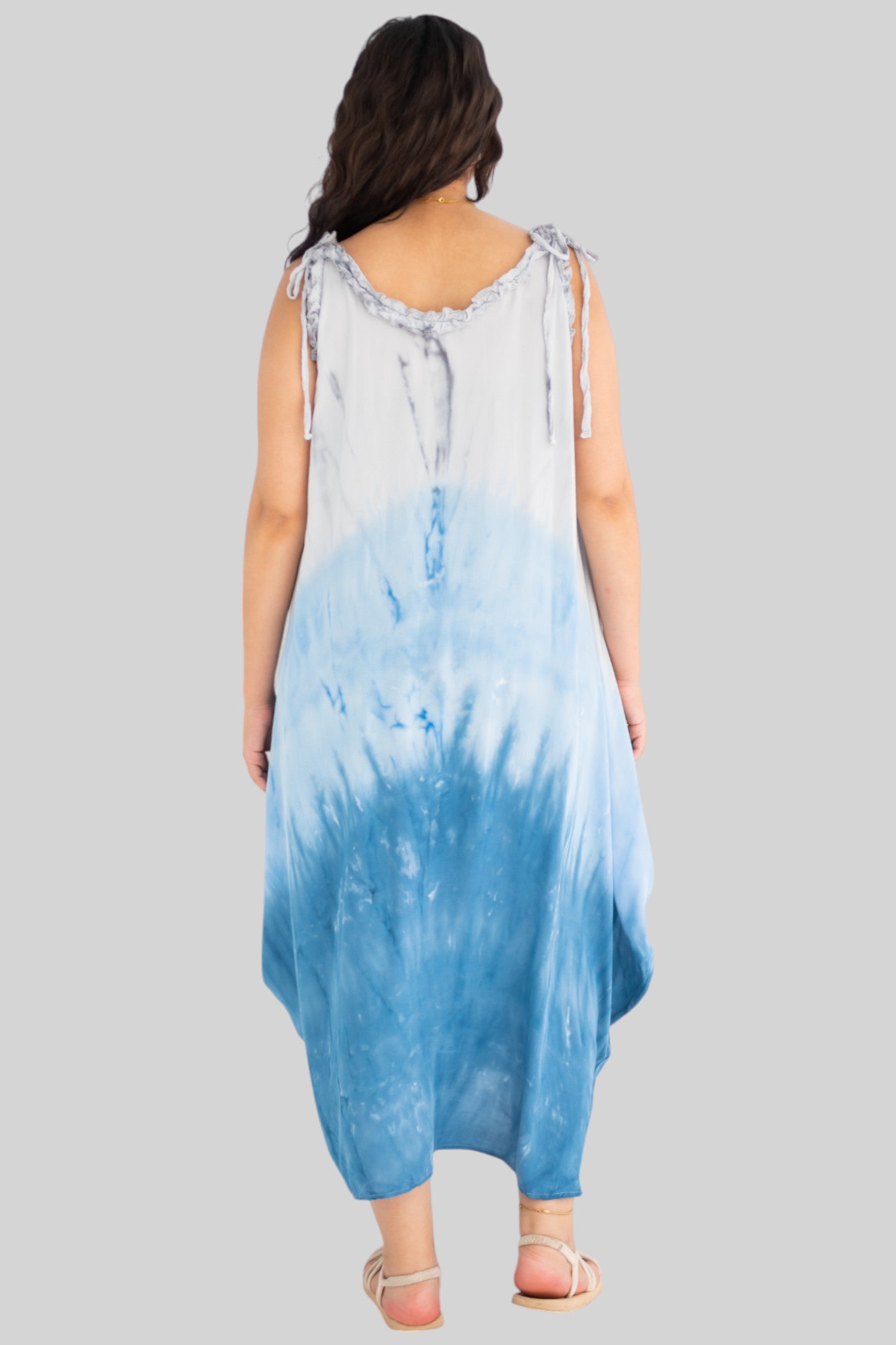 loose dress with adjustable straps, carefully tied and dyed by hand