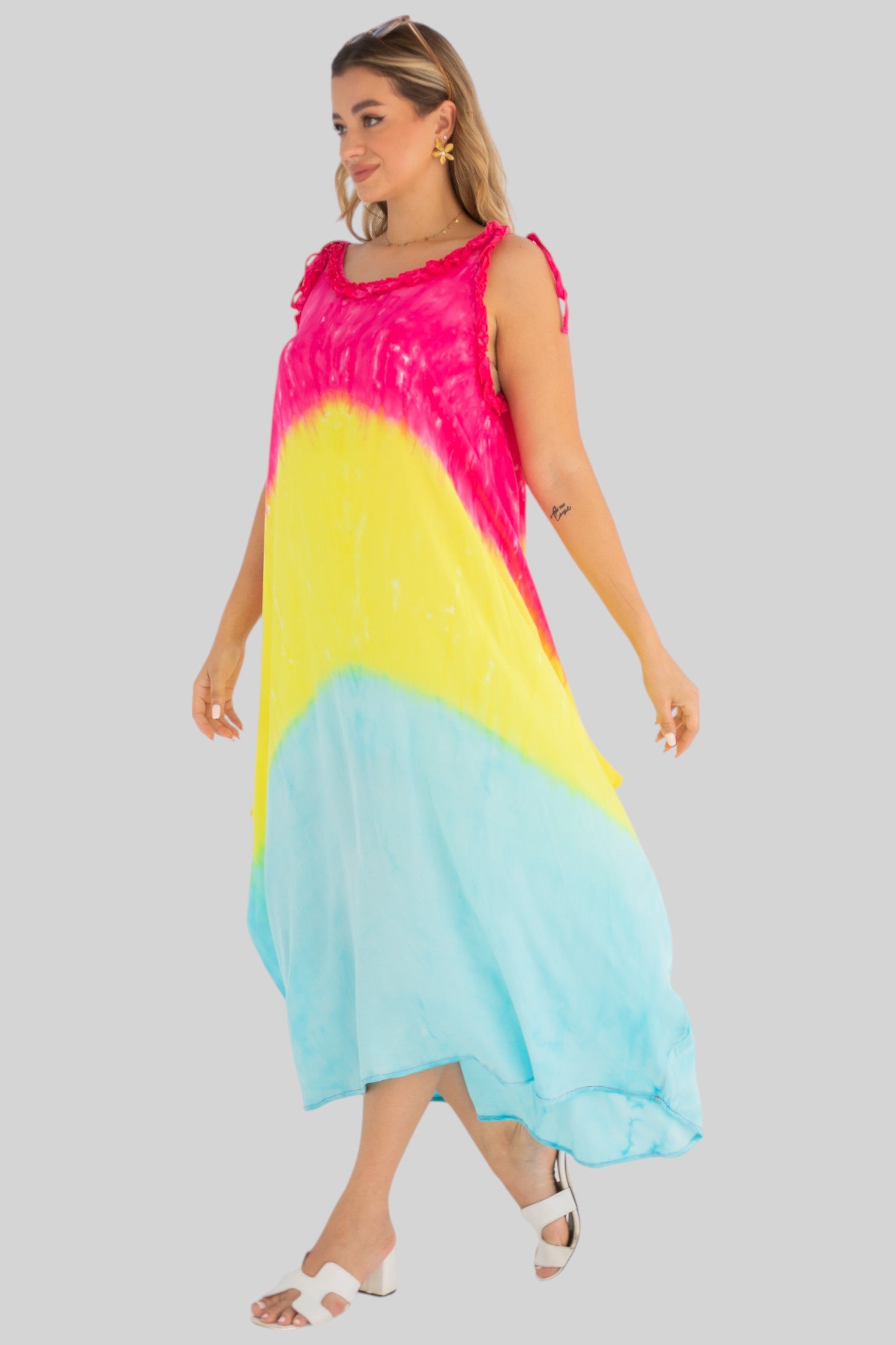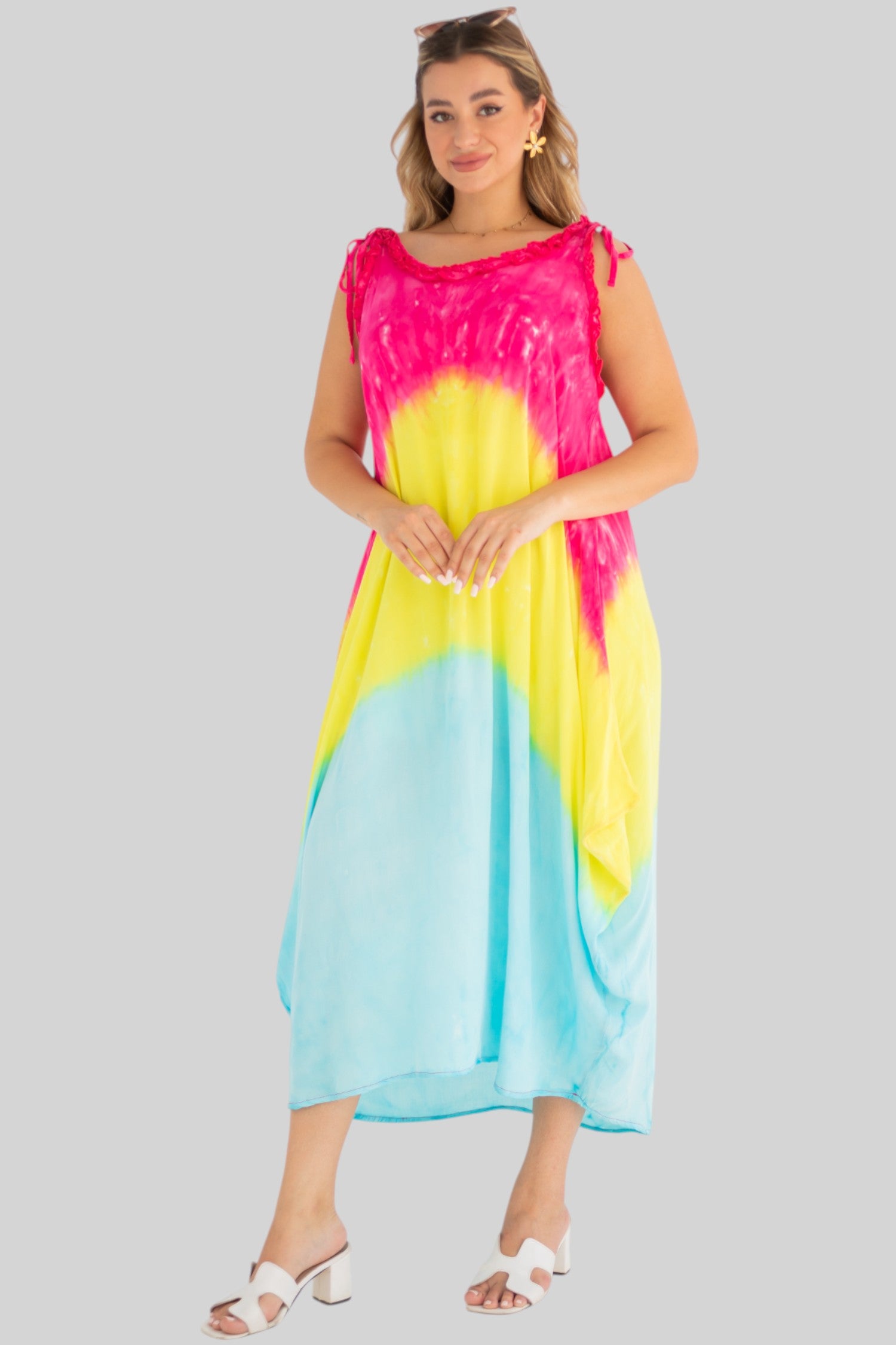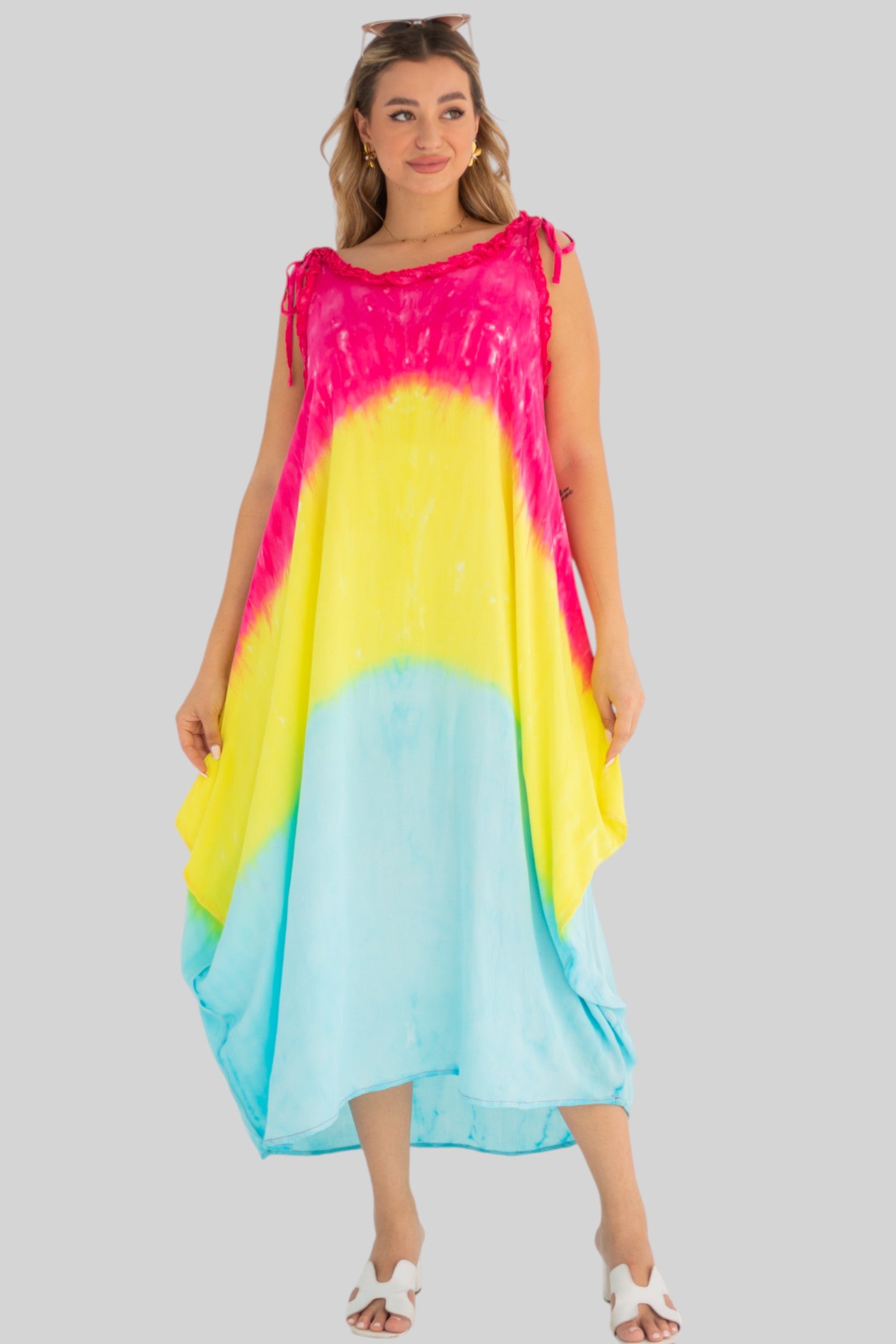 loose dress with adjustable straps, carefully tied and dyed by hand