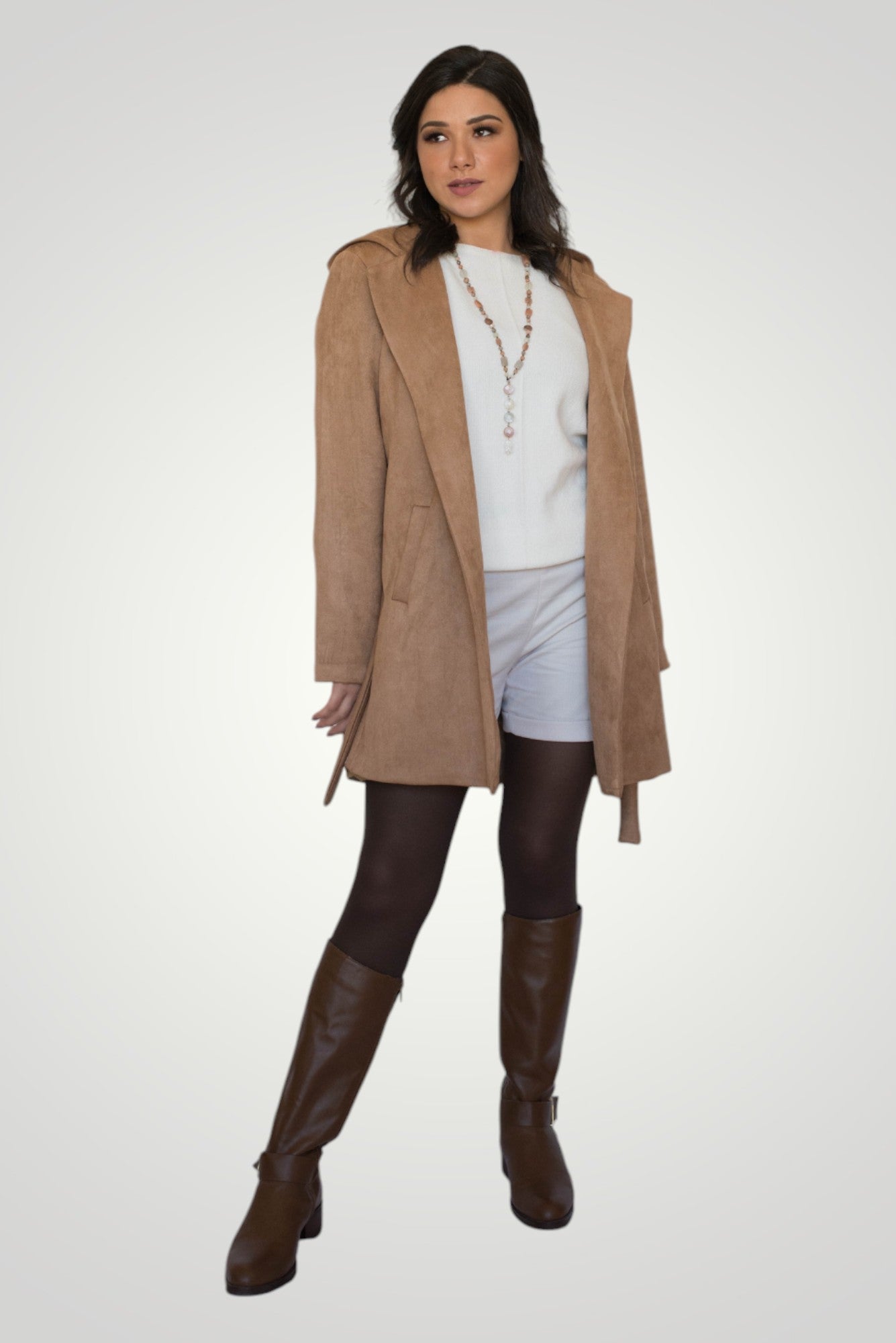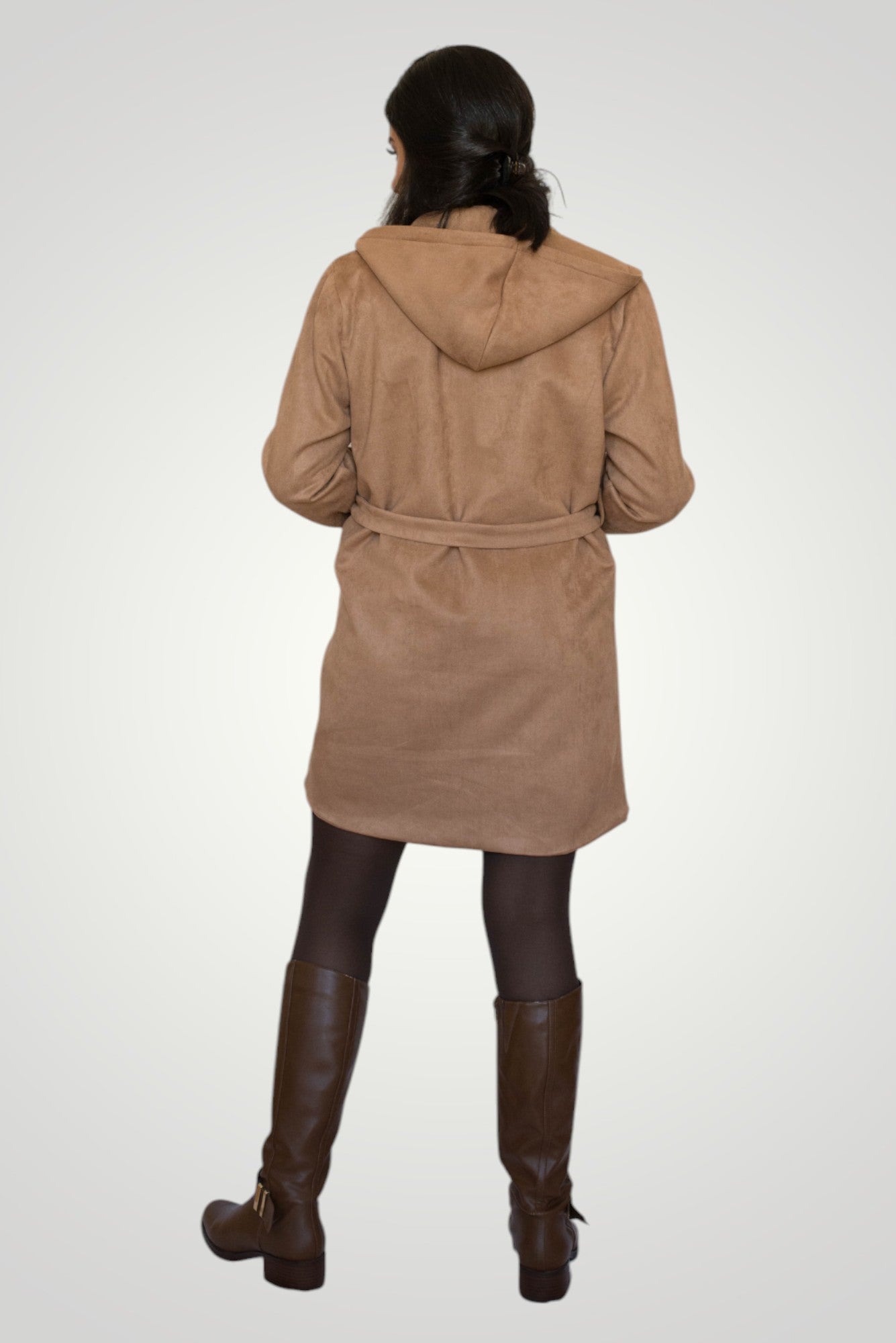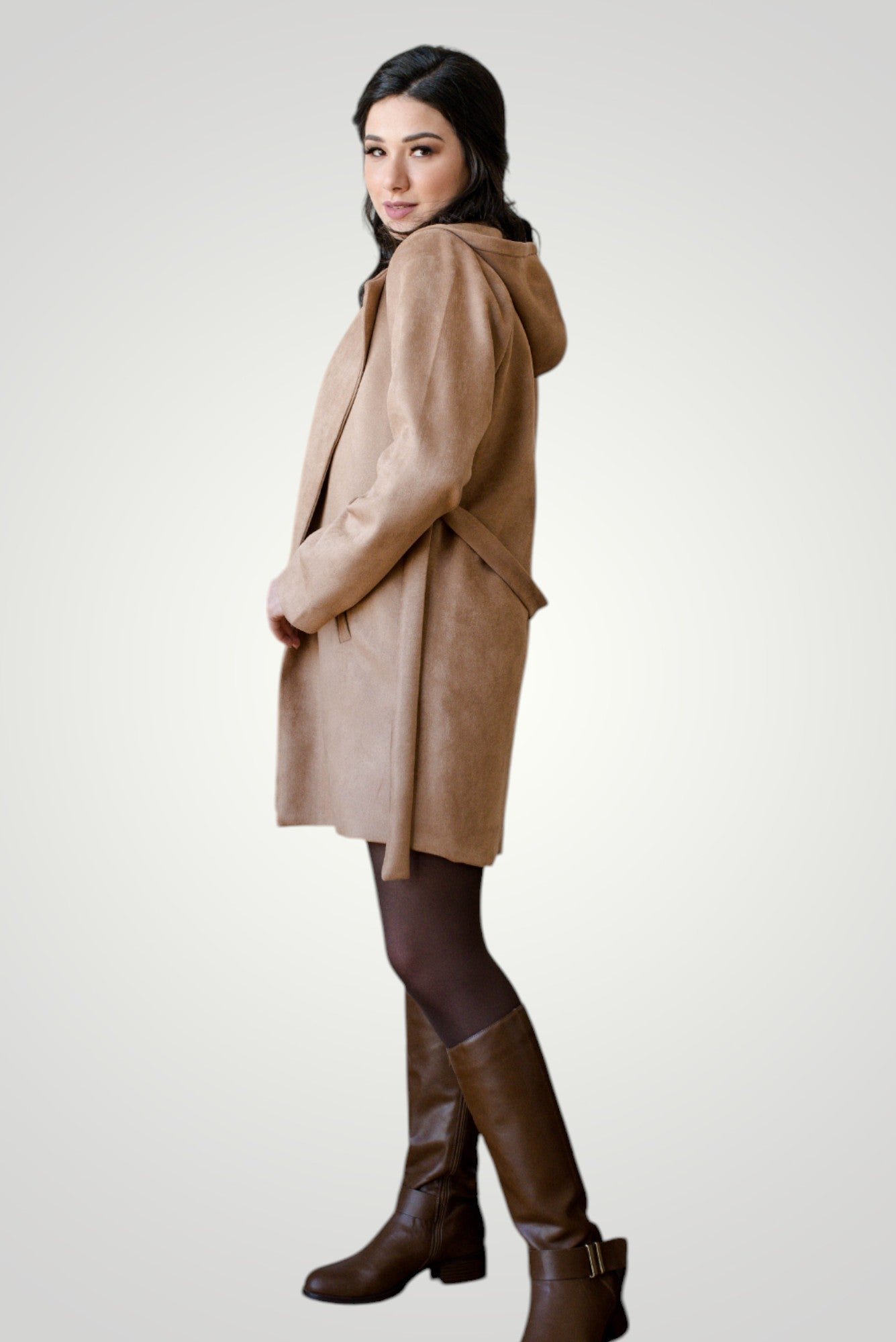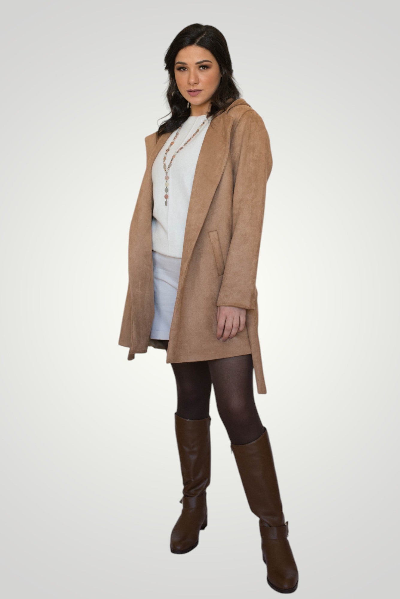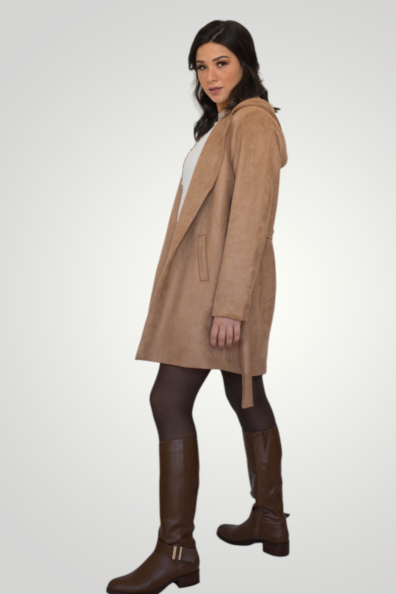 Camel Beige Suede Jacket with Hoody, Lining and Belt