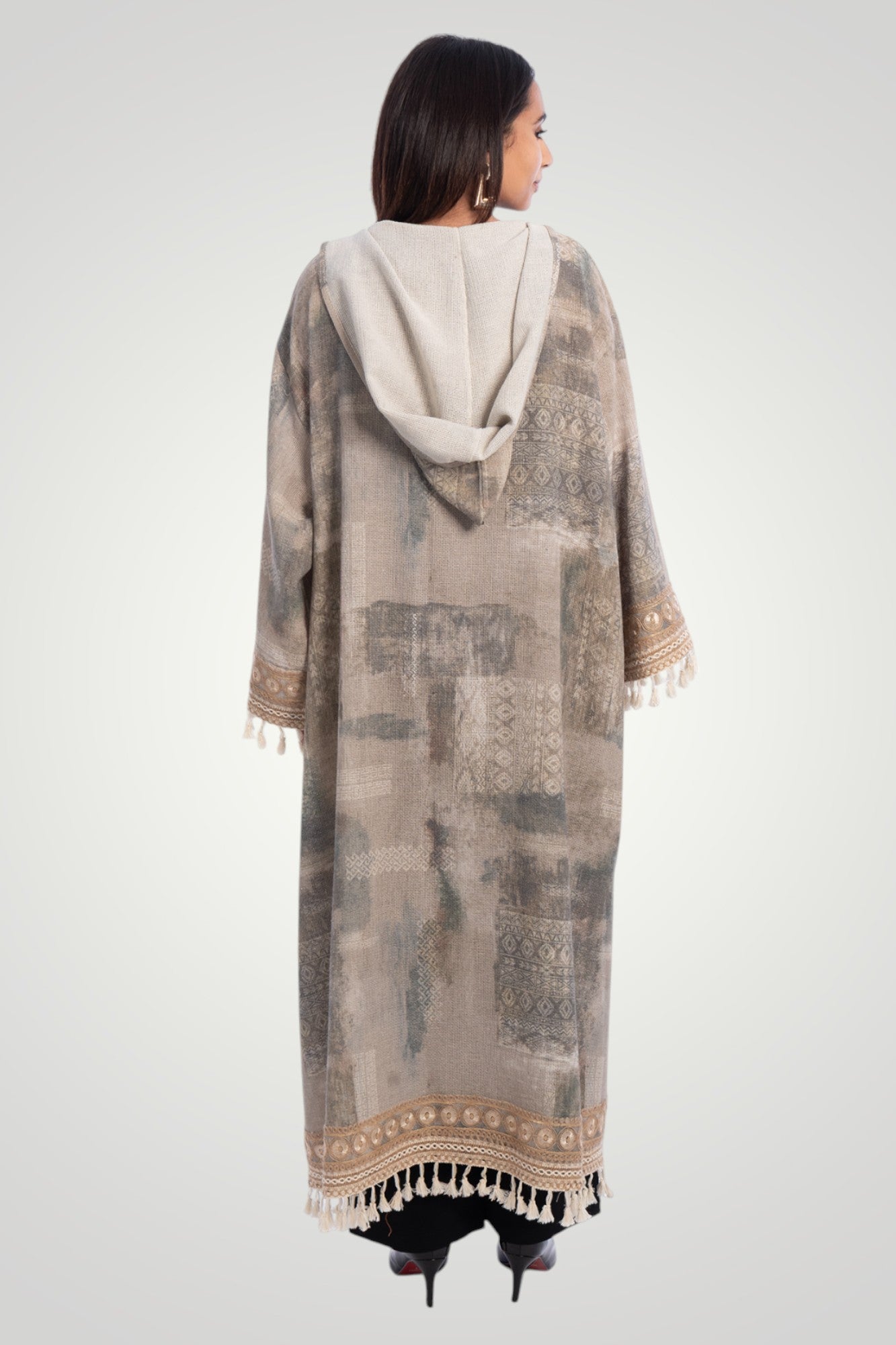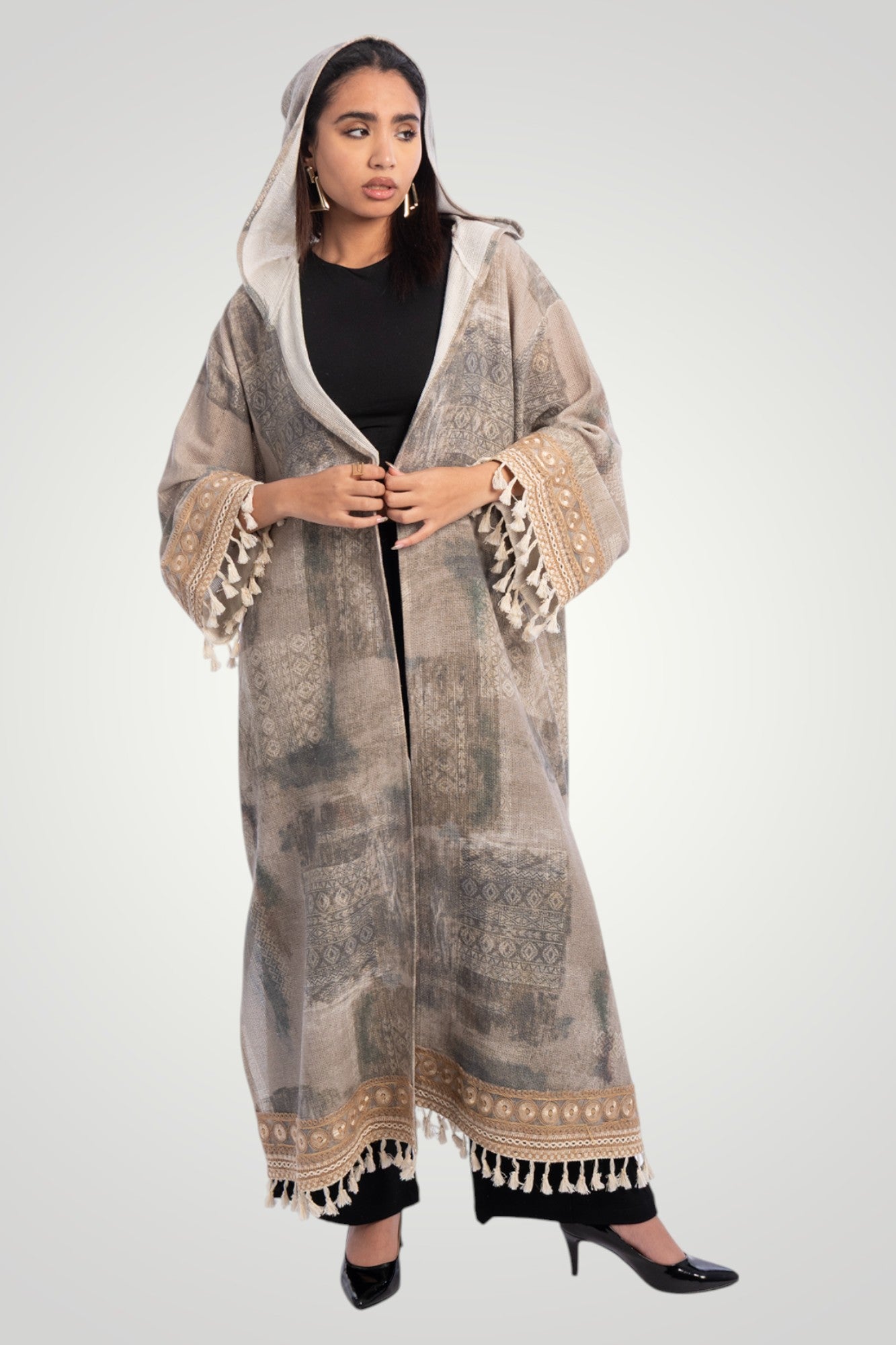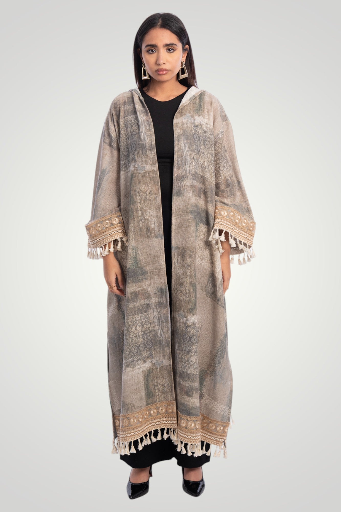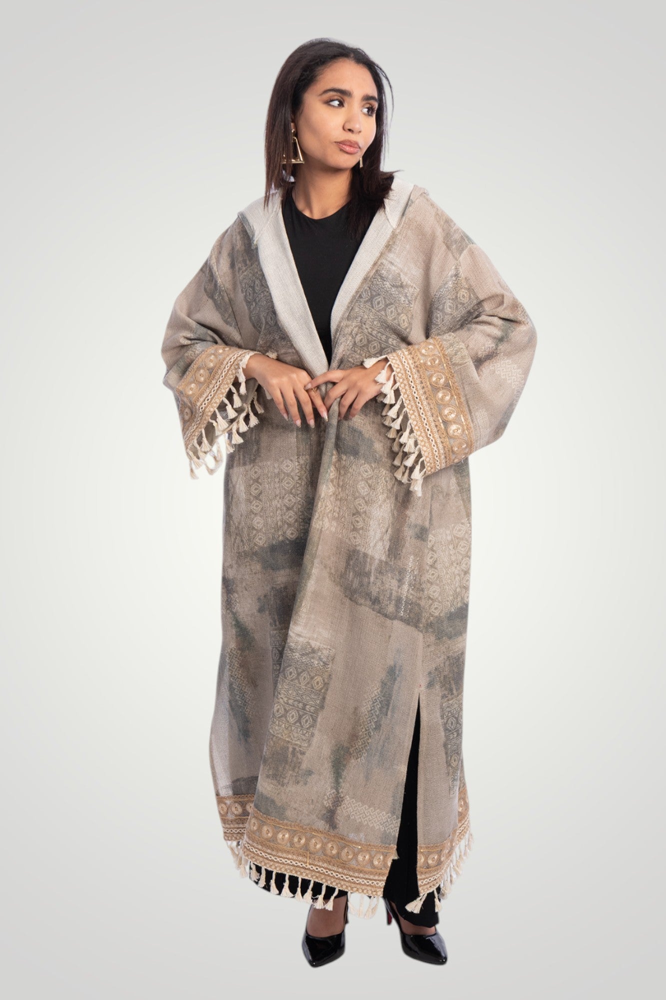 Step into effortless elegance with this beautifully textured kaftan, blending earthy tones with intricate patterns for a truly unique look. Featuring delicate embroidered cuffs and hem with charming tassel details, this piece is perfect for casual outings, resort wear, or layering over your favorite outfit. The relaxed silhouette and breathable fabric provide comfort without compromising style, making it a must-have for any wardrobe.